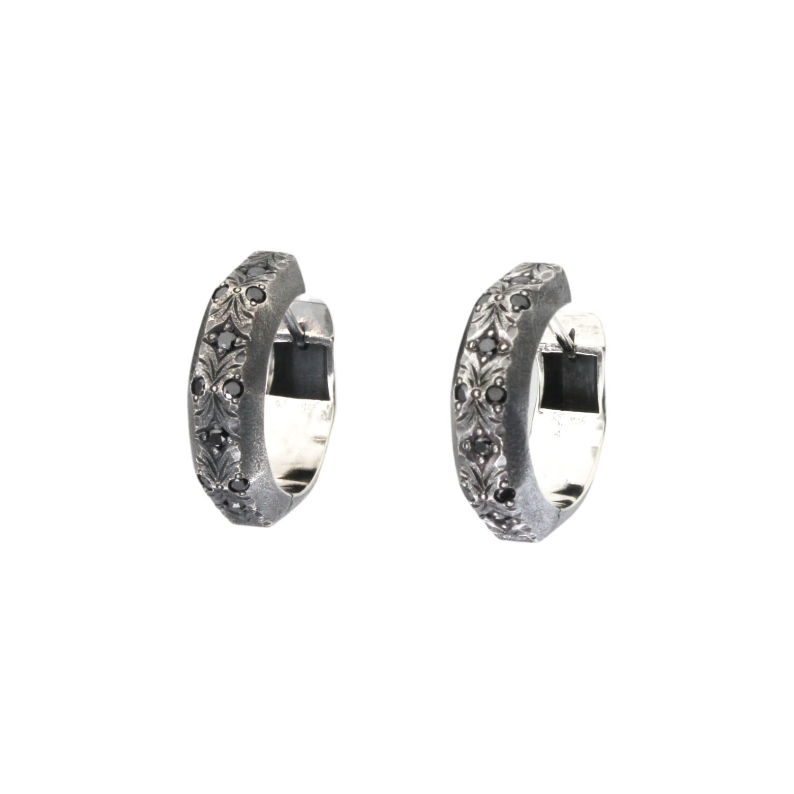 Small Katachi Oval Hoop Earrings with Locking Wire in Oxidized Silver and (3) White Diamonds