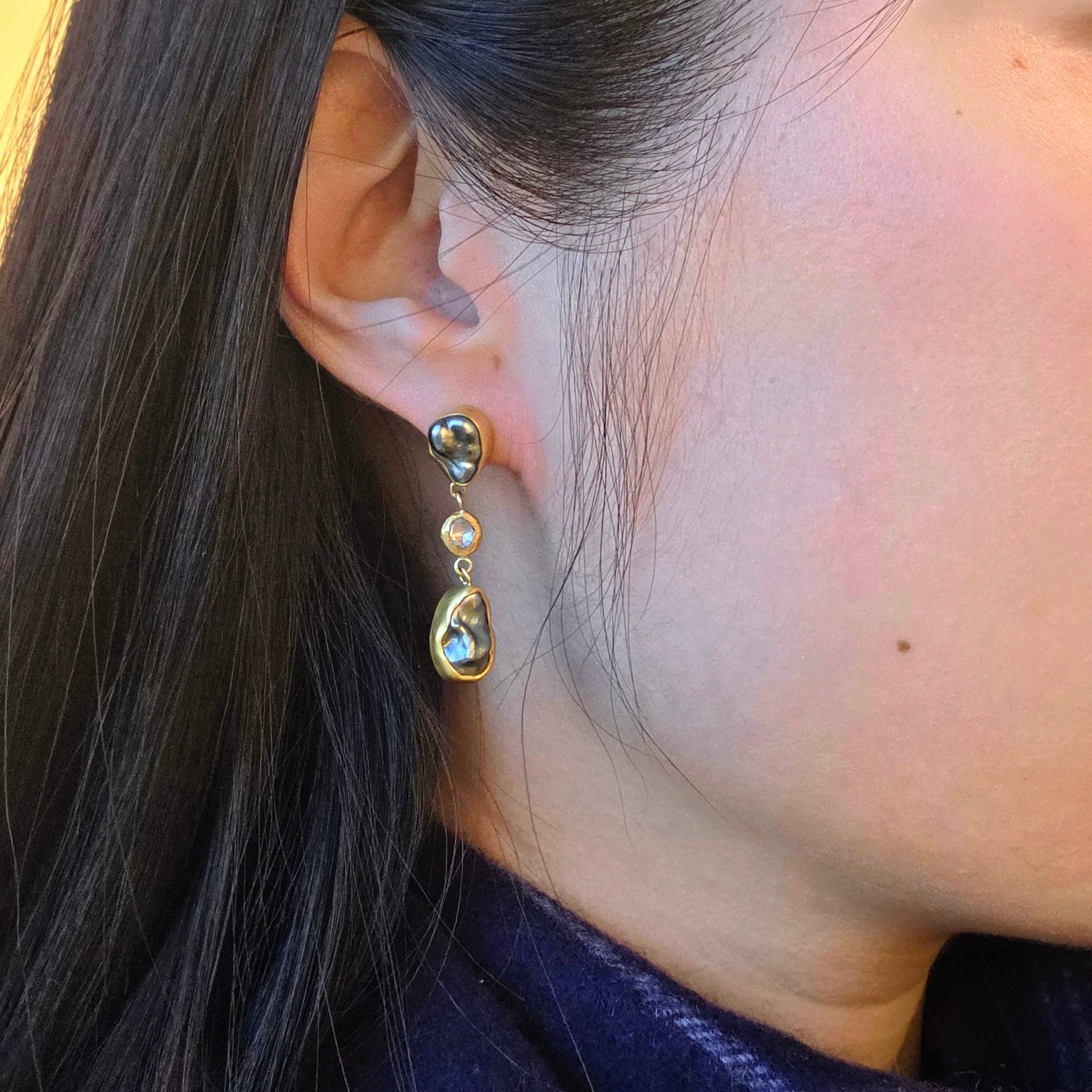 Keshi Pearl Post Dangle Earrings with Salt And Pepper Diamonds in 18k Gold