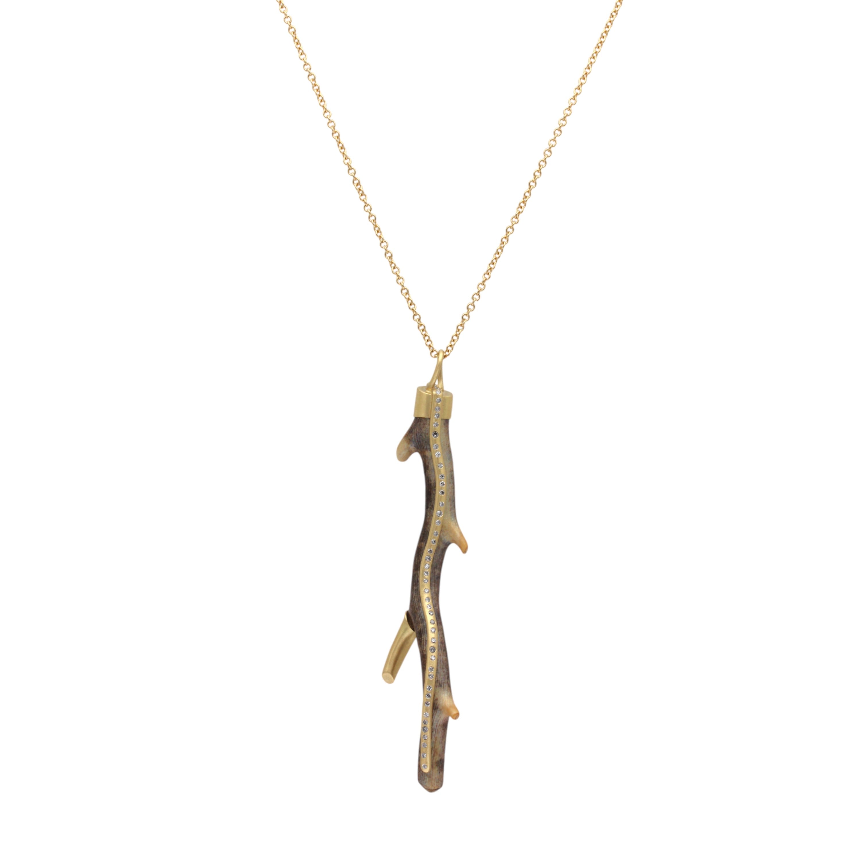 Fossilized Coral Branch Pendant with 47 Grey Diamonds in 18k Yellow Gold