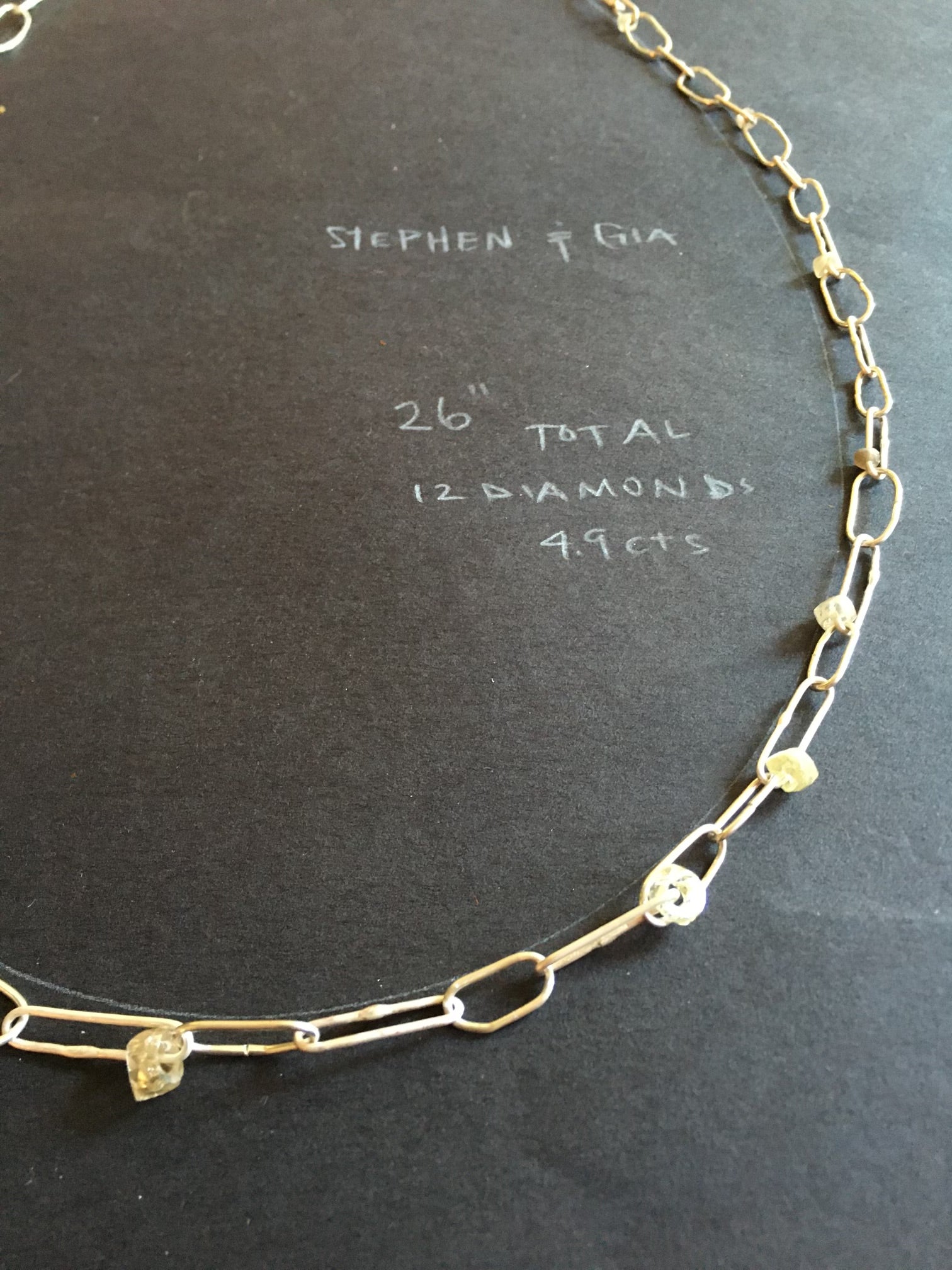 Process: This chain was designed for a bioscientist who wanted to give his wife a birthday gift. Each industrial diamond bead holds special significance, moving along the link in a manner reminiscent of a Japanese abacus.