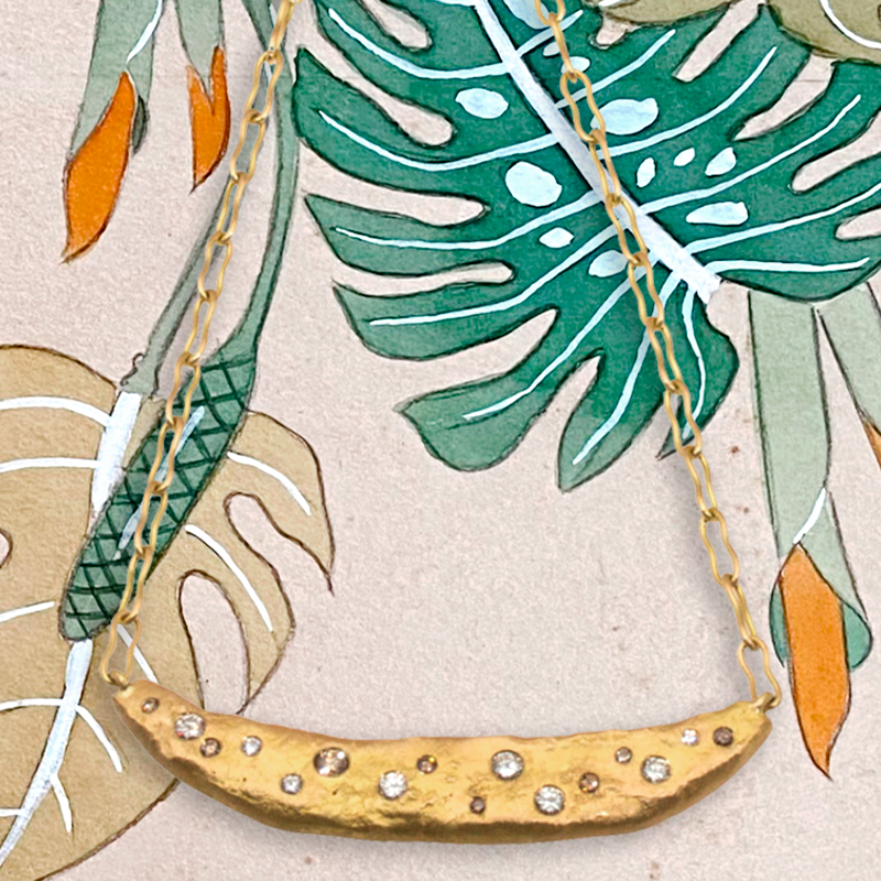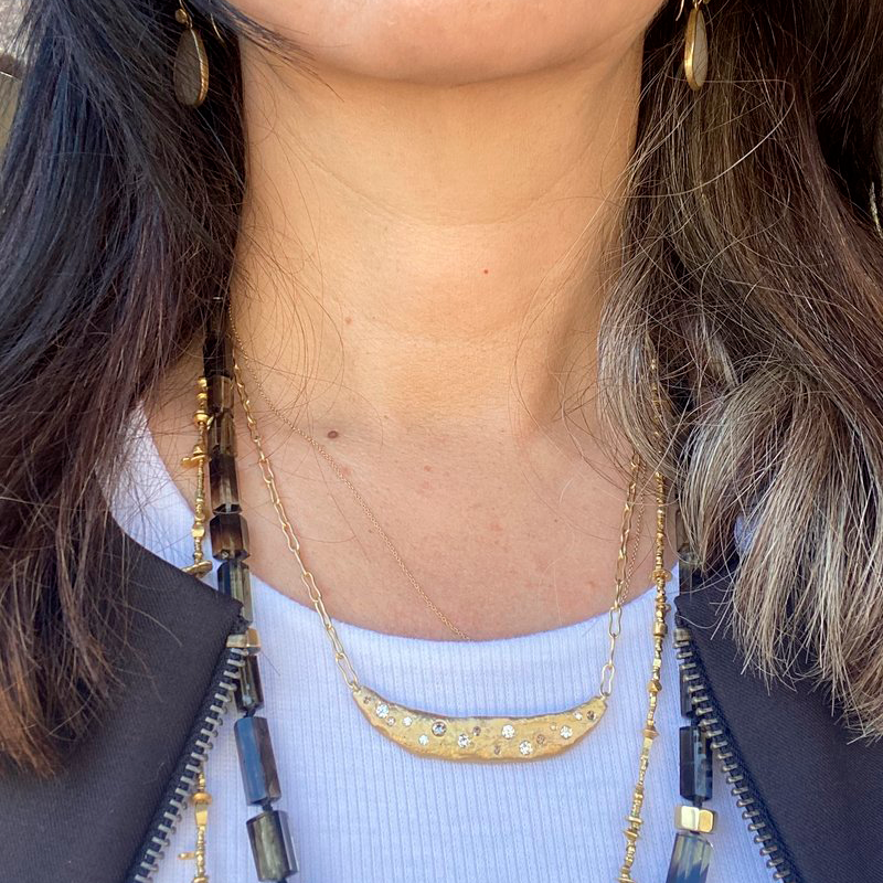 Process: This client came to me wanting an organic bar necklace. She had some gold and diamonds, so we added a hand-made chain to this one-of-a-kind necklace.