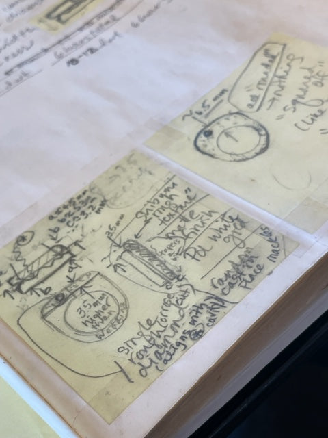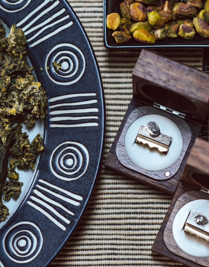 After carefully selecting a stone, we texted him photos from Tucson's largest gem show. We were able to bring a few back on memo to show him so he could finalize his choice in person. We hand-carved this wax using the specs of his original wedding ring, selecting a complimentary but contrasting metal color. The stone was set and then we figured out an earthy texture for the top segment of the ring.