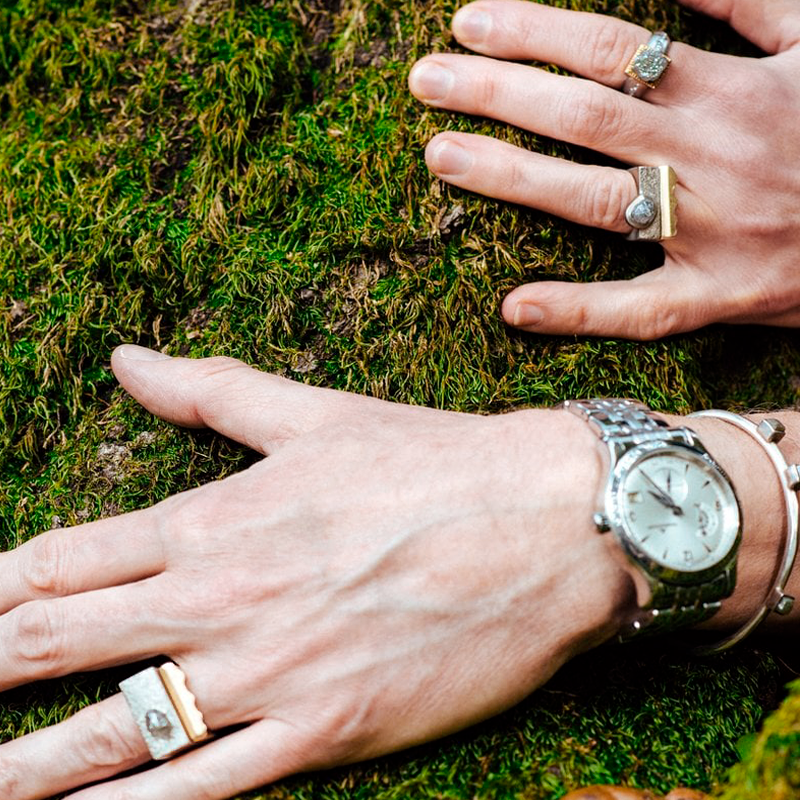 Process: This ring was commissioned for a twenty-fifth anniversary to compliment the man's original wedding ring. The idea is that the stone would be emerging from the surface with a low glow.
