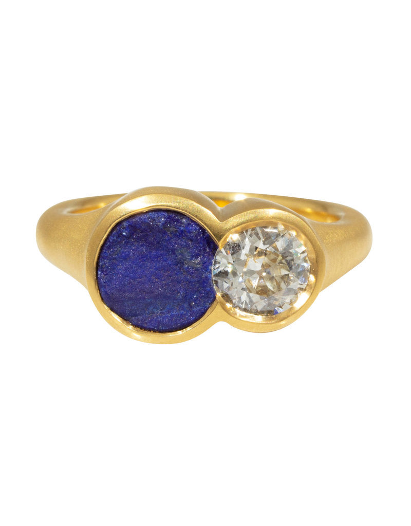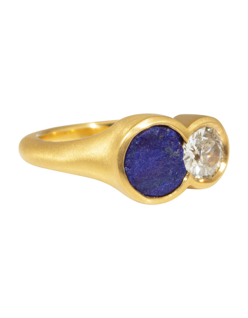 Process: This ring was designed for a Landscape Architect who had worked in Europe and the US. She was no longer married and wanted to make a ring for herself that was not a wedding ring, but something she would love and cherish and wear on her middle finger to remind her of her life. She had always loved lapis, so we found a piece that mirrored the rough feeling of terrain. This ring was hand-cut from wax and cast in 22k gold. The lapis was modified to fit next to the diamond and then set.