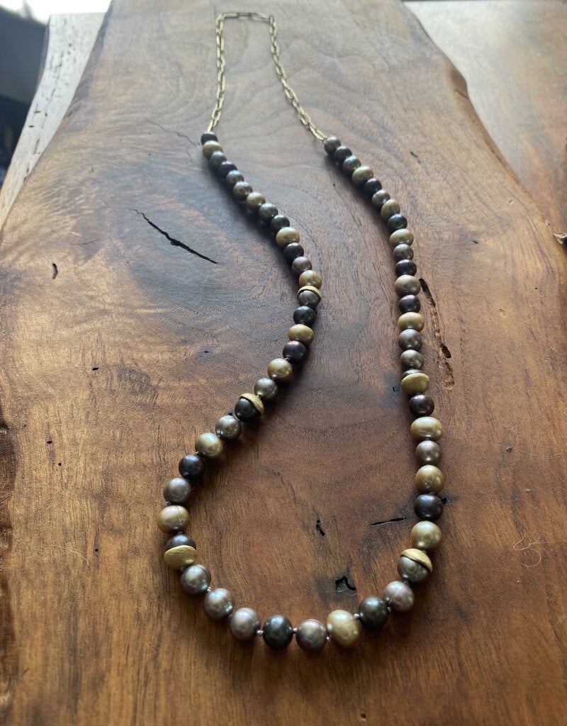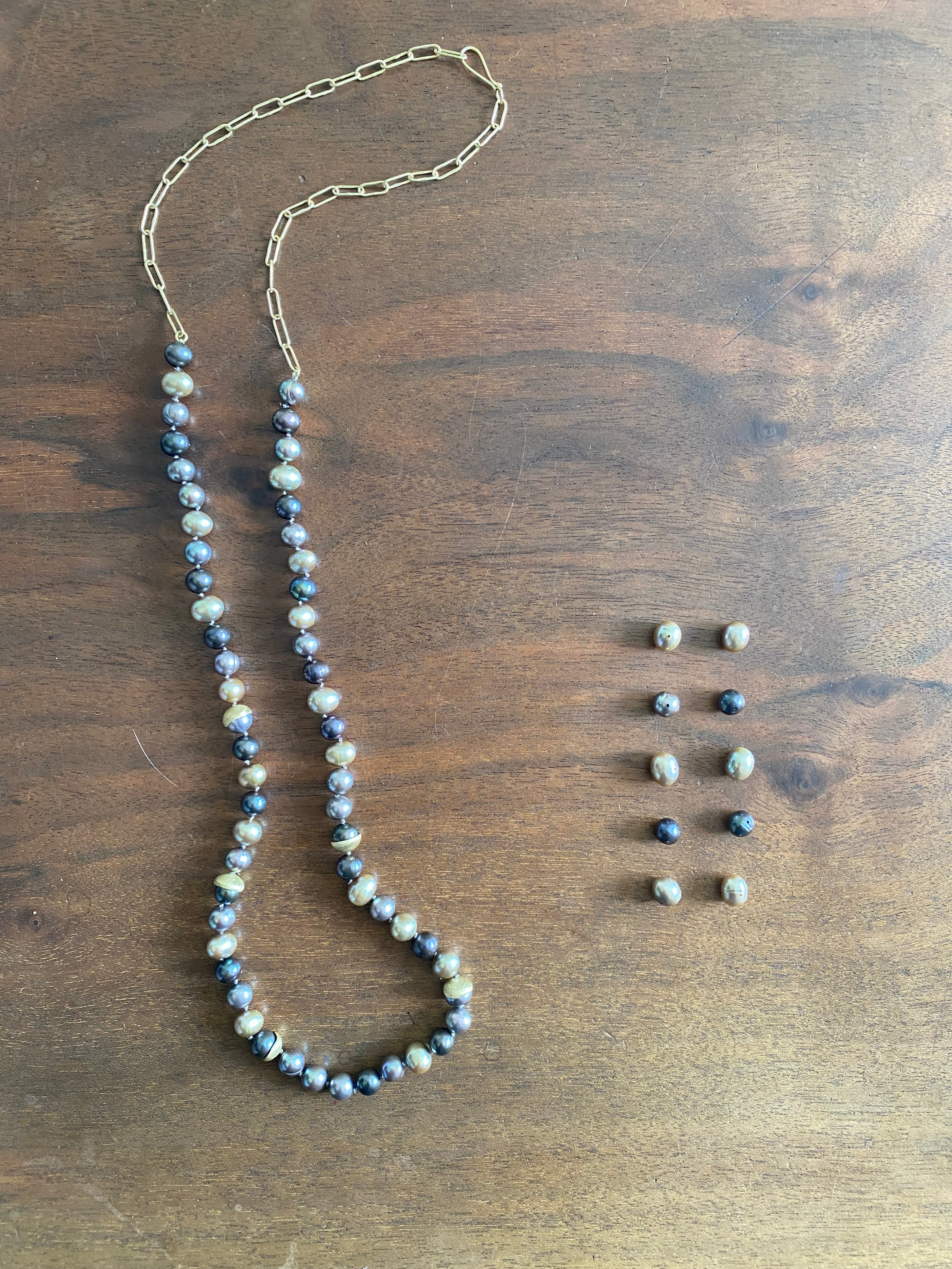 Custom Mixed Baroque Pearl Necklace with 18k Gold Handmade Chain and Caps, client's pearls, 18k yellow gold, silk