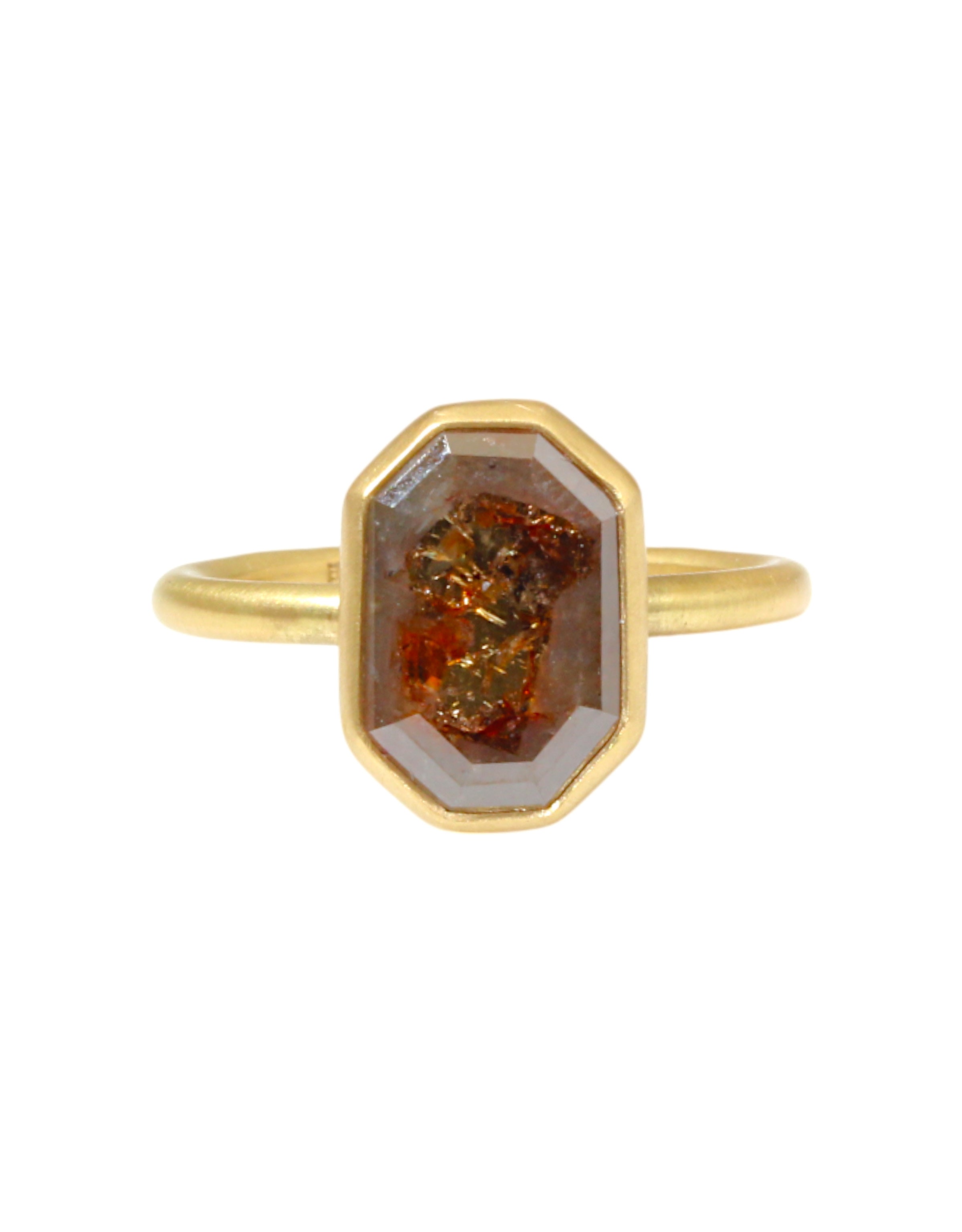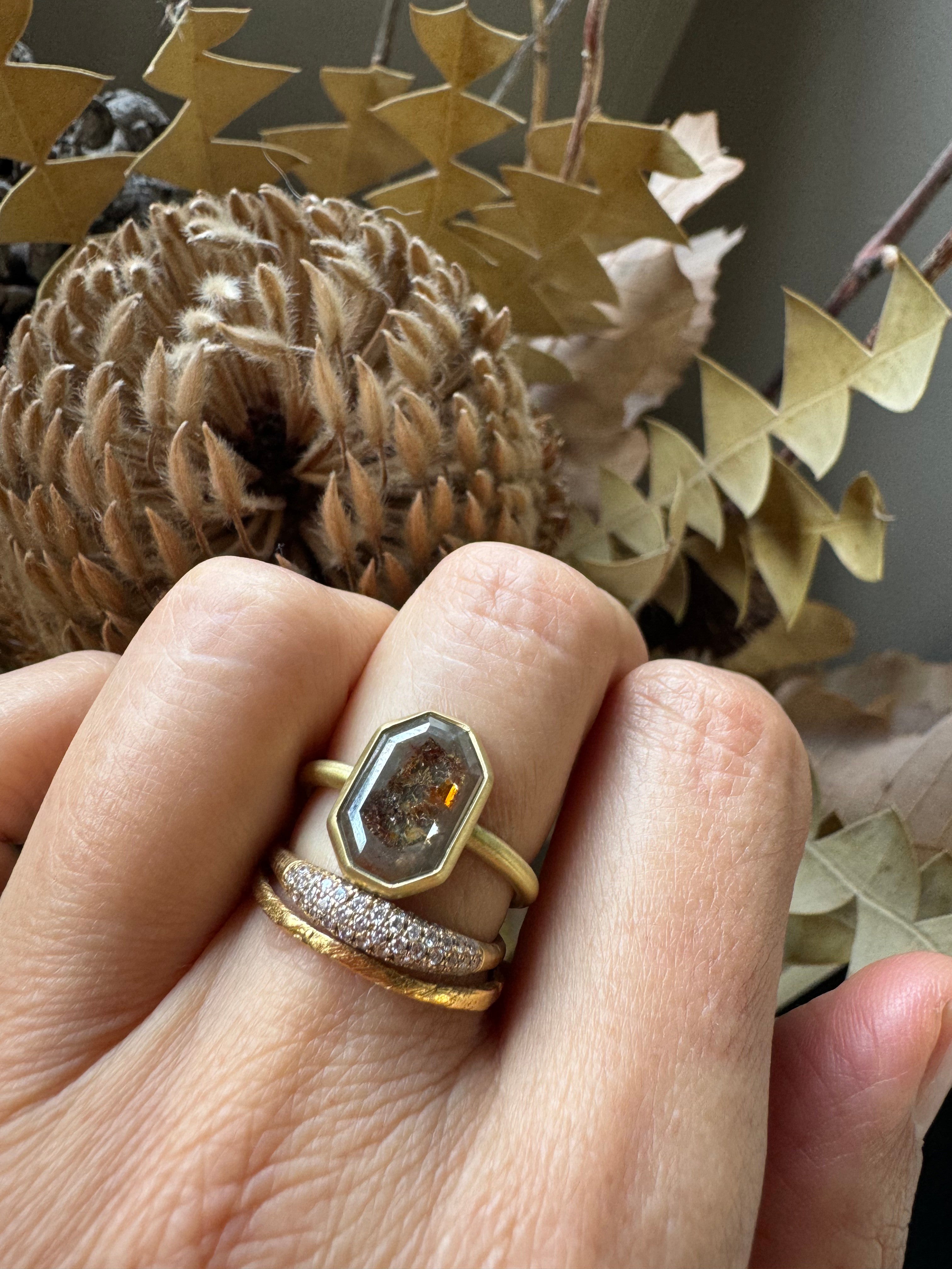 Process: This ring features a rustic diamond set in 18k gold. The design was inspired by the unusual and rare diamond, which resembles a painting. The setting is kept simple to highlight the unique characteristics of the diamond while also allowing for the addition of a thin stacking band.