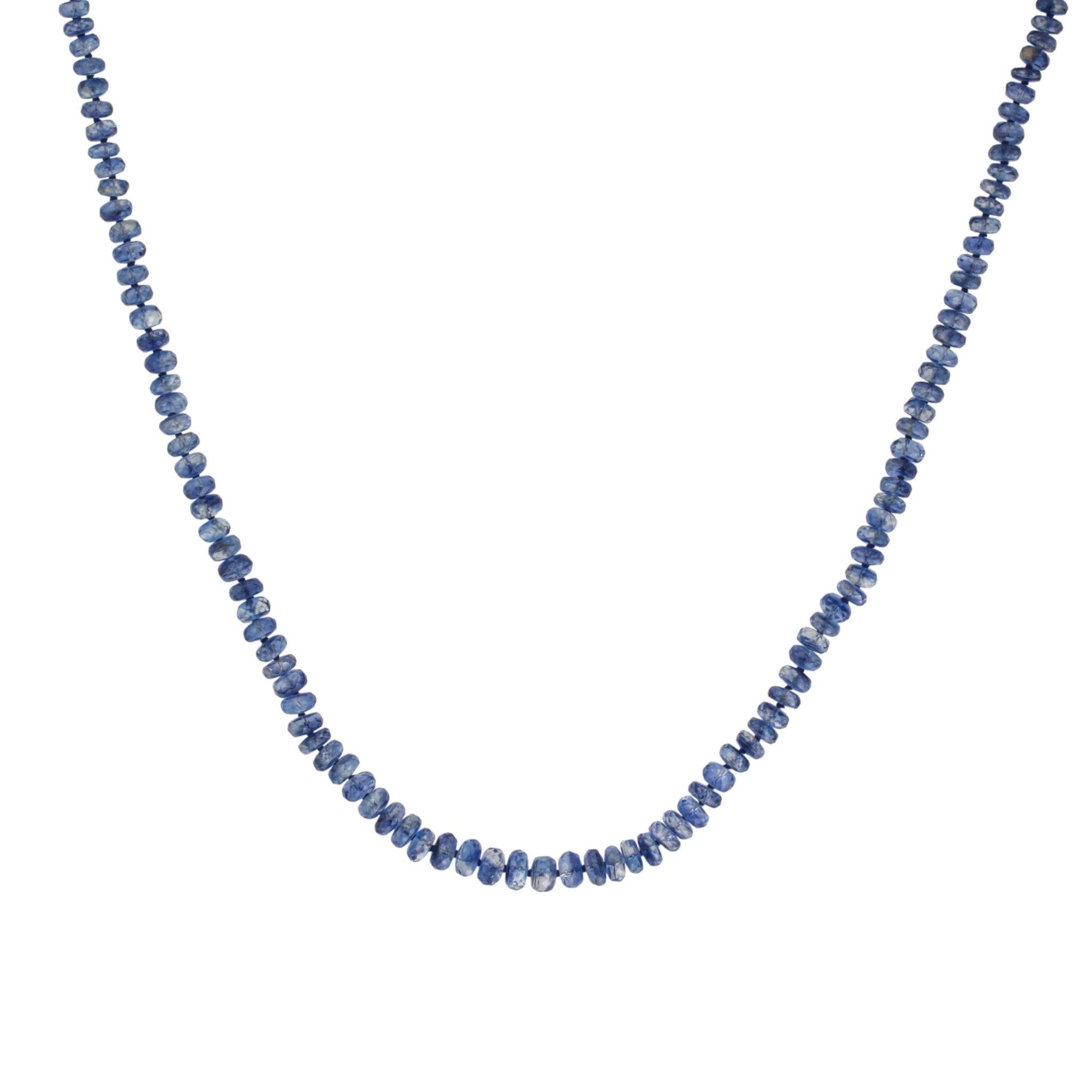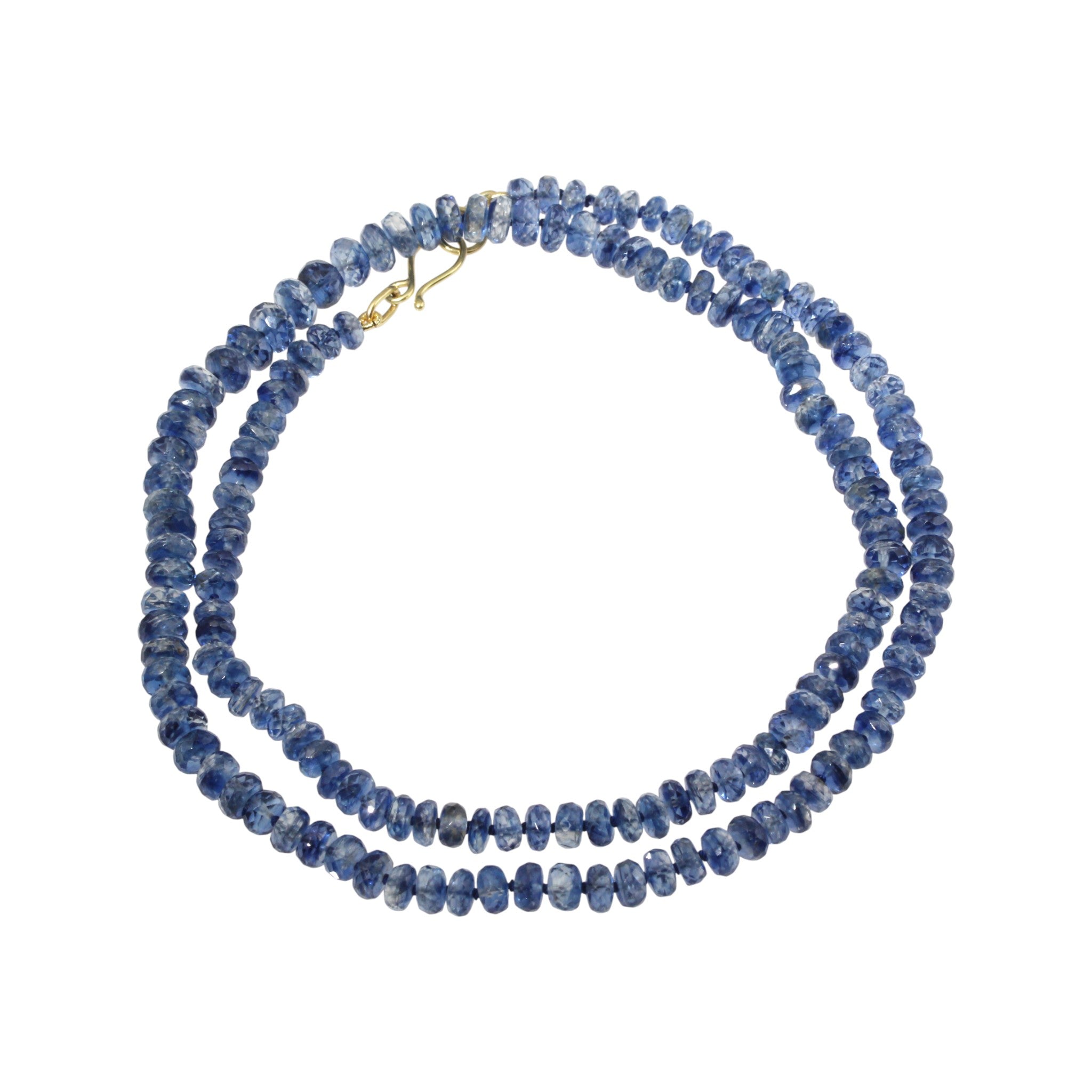 4.5-6.5mm faceted dark blue kyanite beads knotted with dark blue colored nylon thread and finished with 18K gold clasp