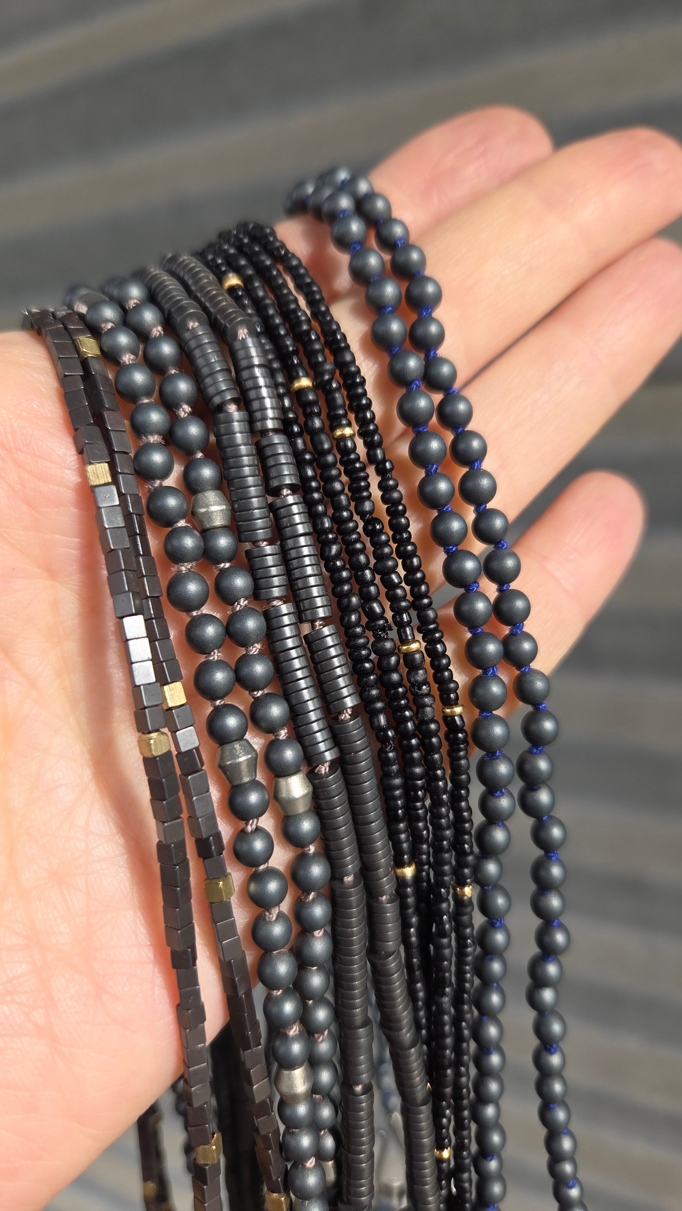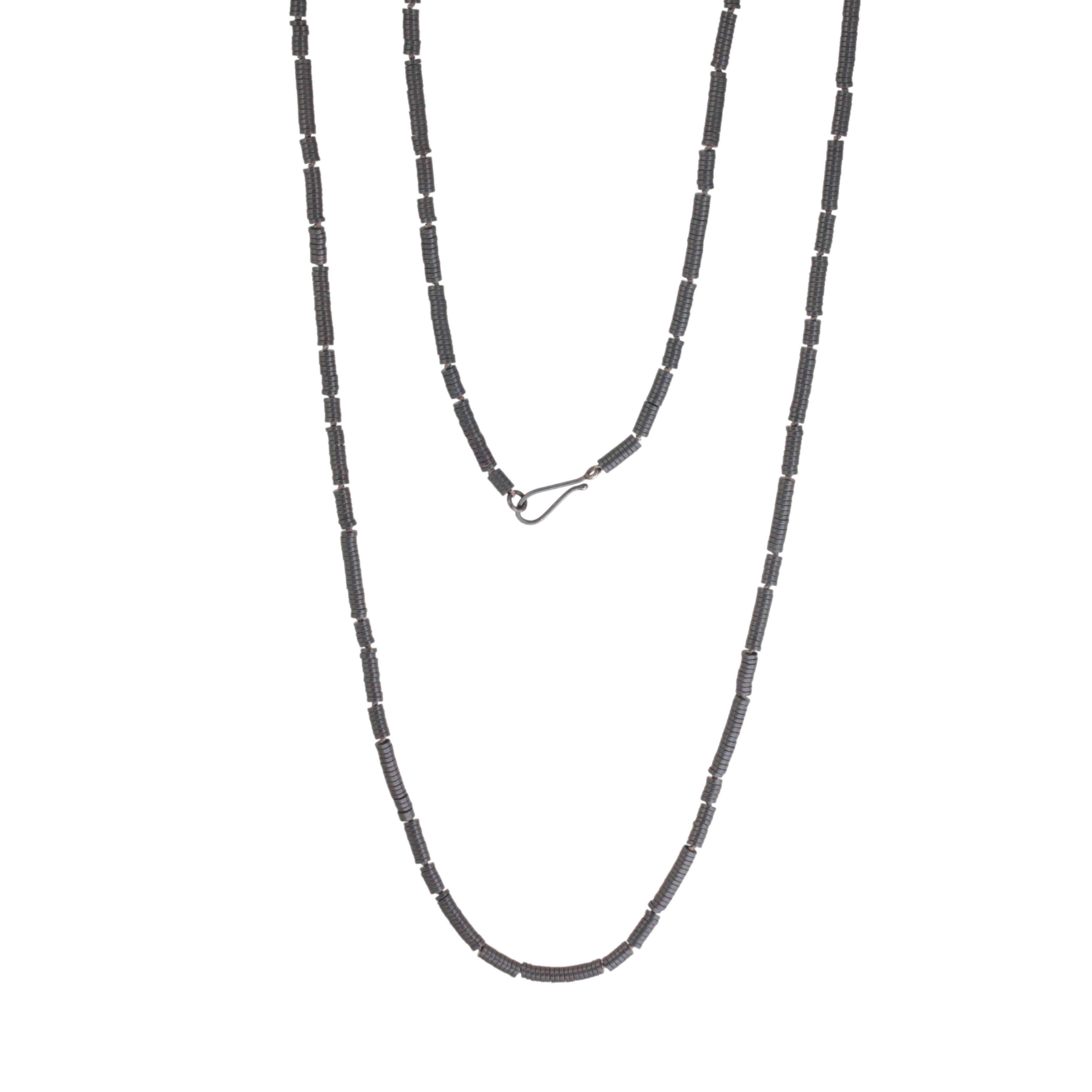 Dark Grey Hematite Disc Bead Necklace with Oxidized Silver Clasphematite, silver, silk