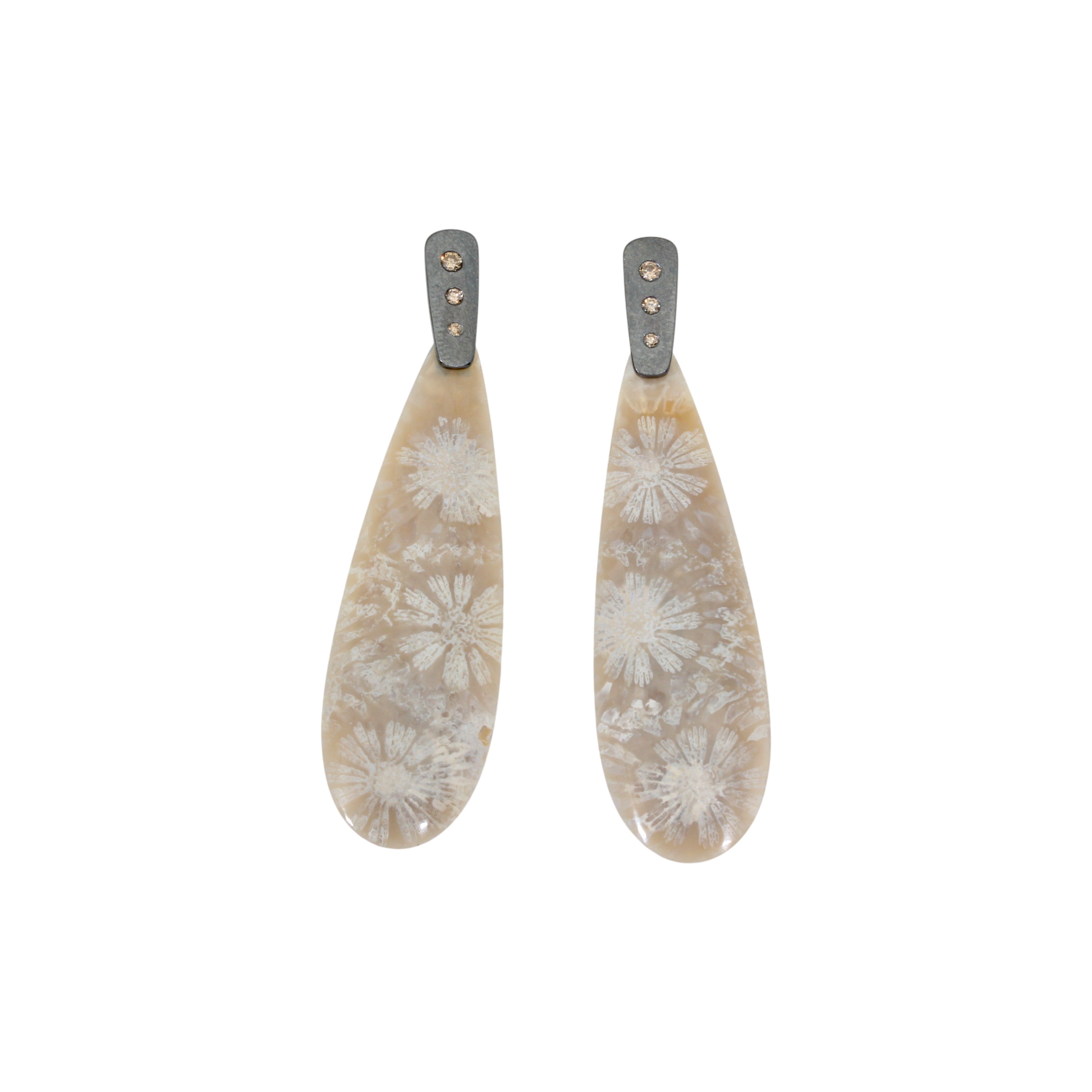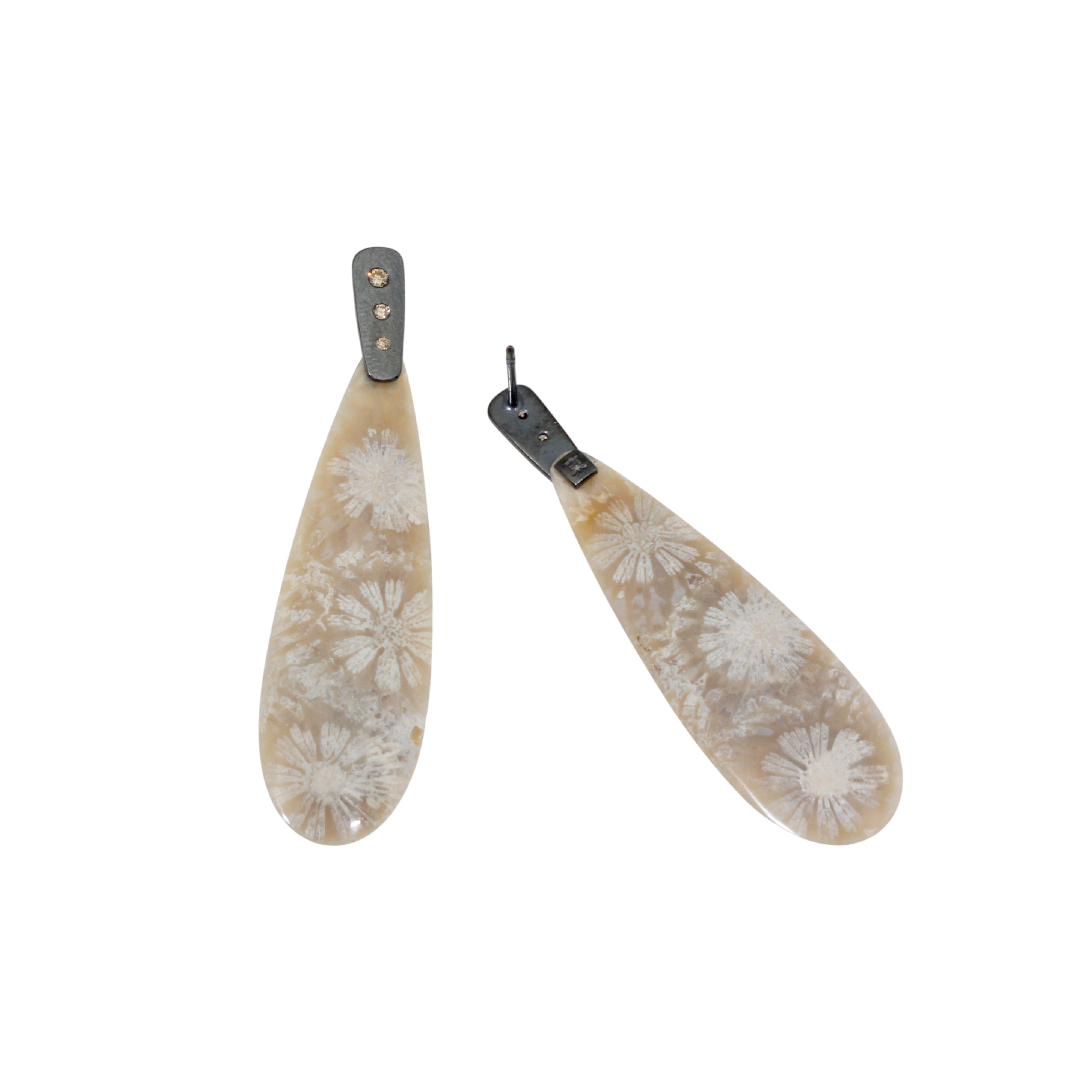 Fossilized Coral Post Dangle Earrings with Oxidized Silver Top and Cognac Diamonds fossilized coral, silver, cognac diamonds