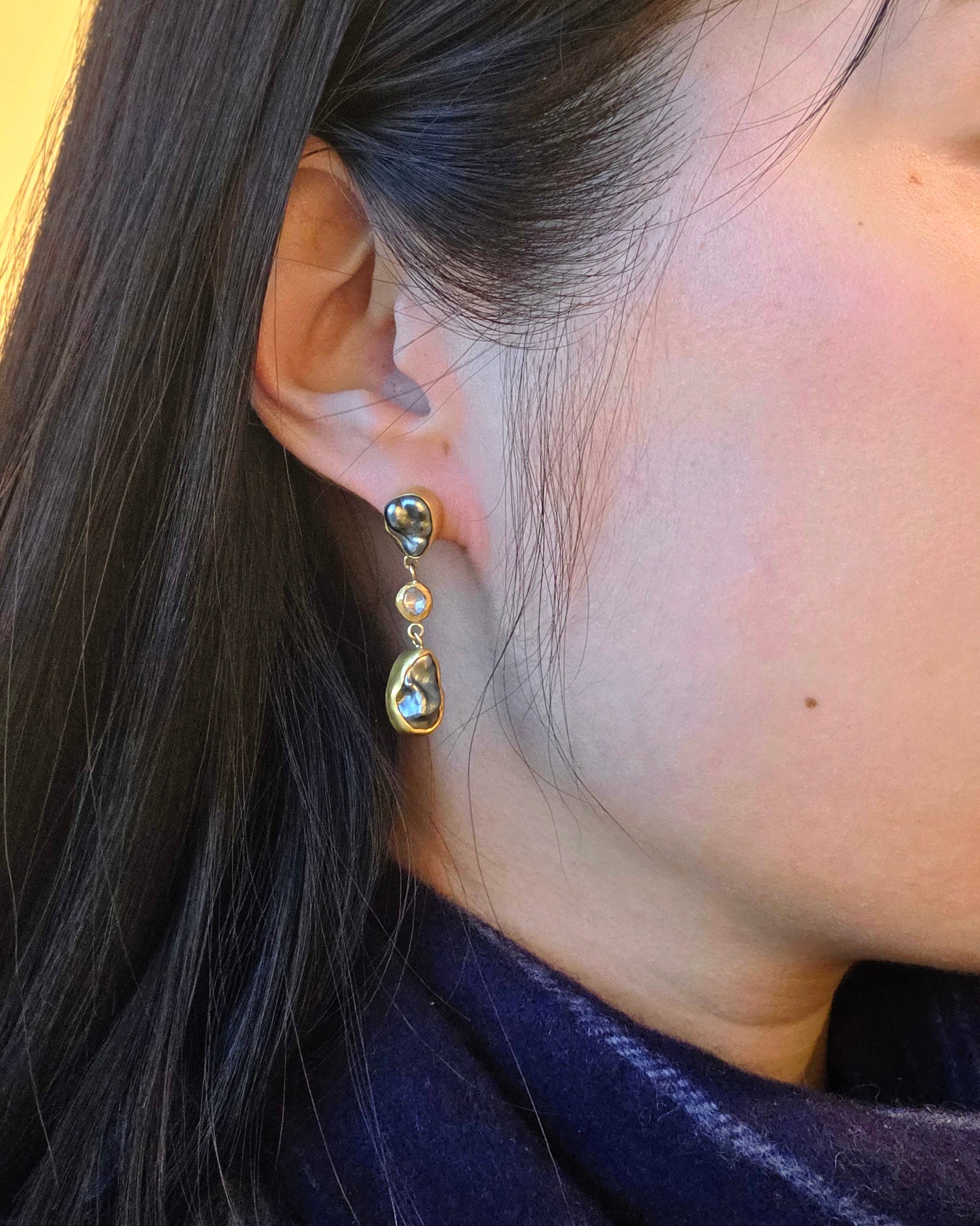 Keshi Pearl and Rose Cut Diamond Earrings in 18k and 22k Goldpearls, 22k bezels and 18k gold jump rings, organic shaped rose cut diamonds.