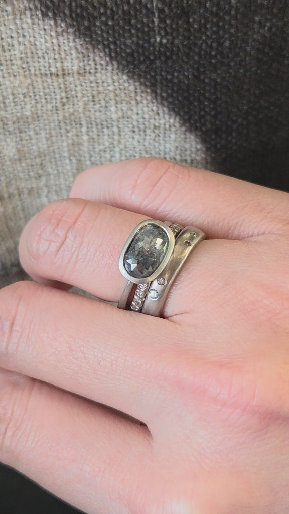 This solitaire is built around a beautifully faceted one of a kind natural diamond with a soft transition from lighter to darker grey. Designed with a raised setting to easily stack with a band, and a tapered shank to add weight to the bottom of the ring, helping to balance out the stone.