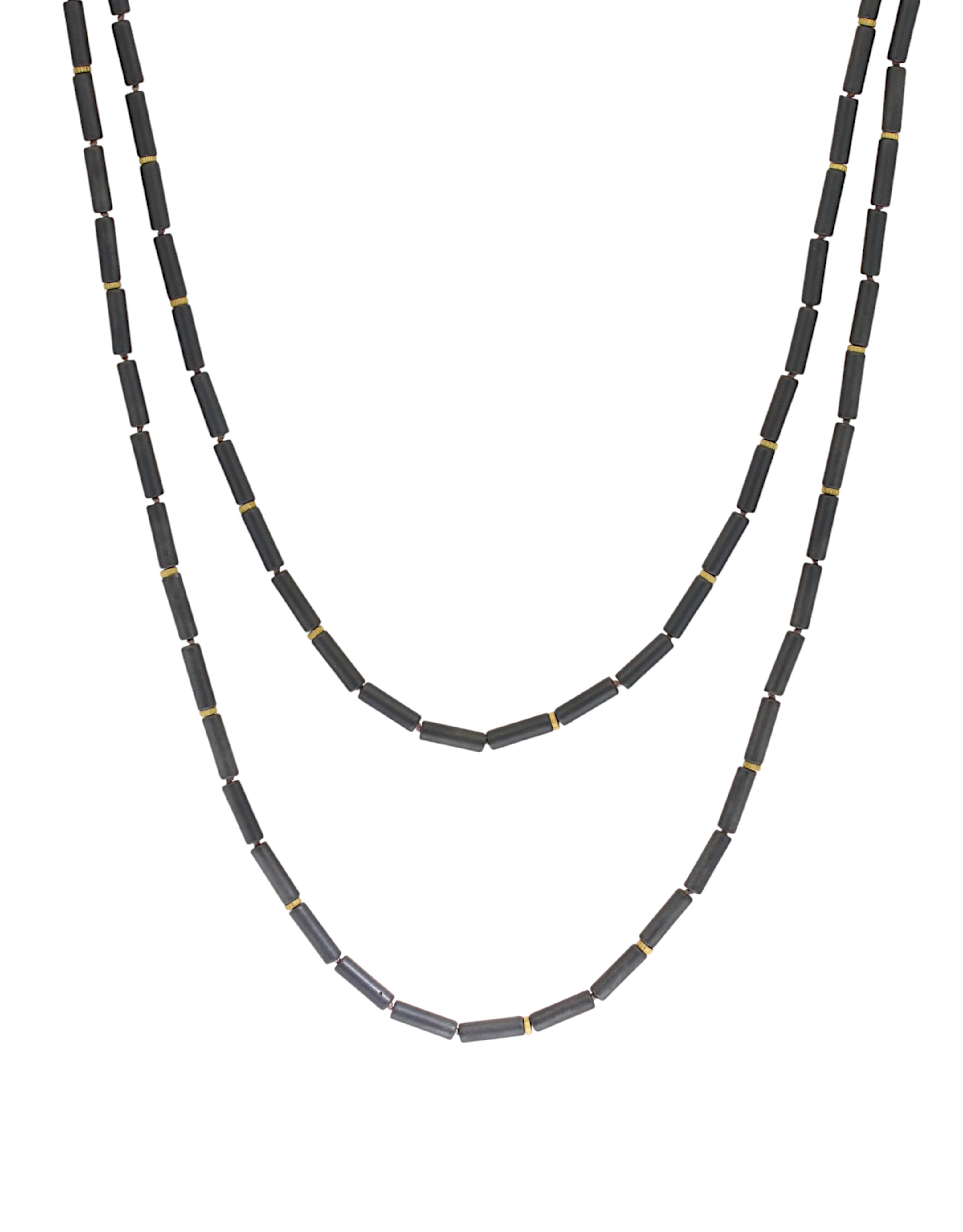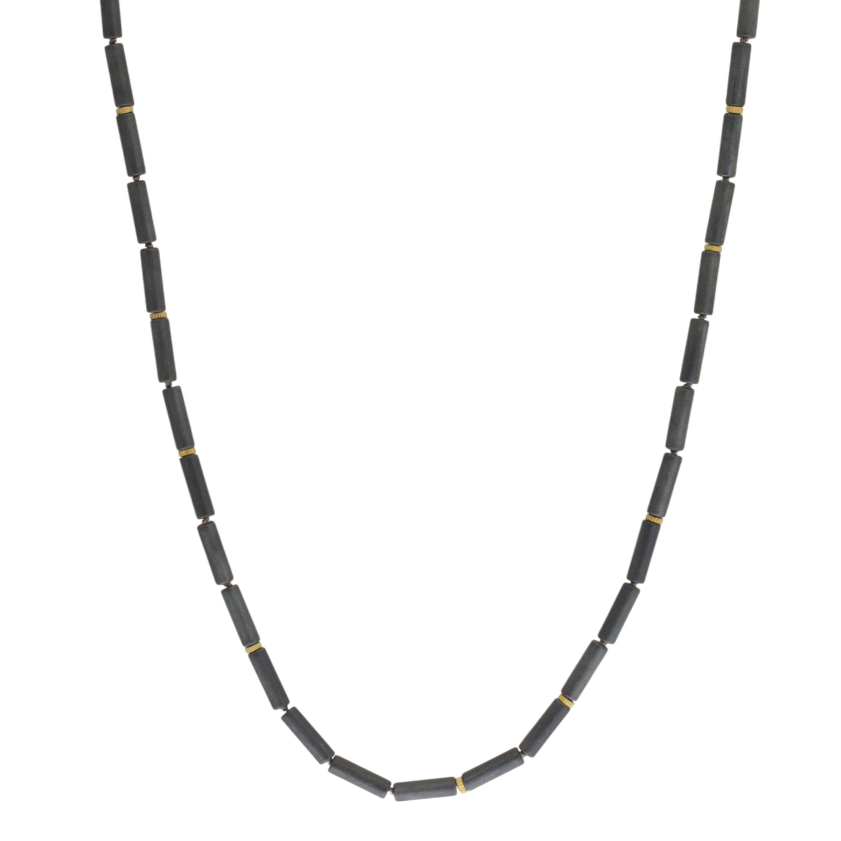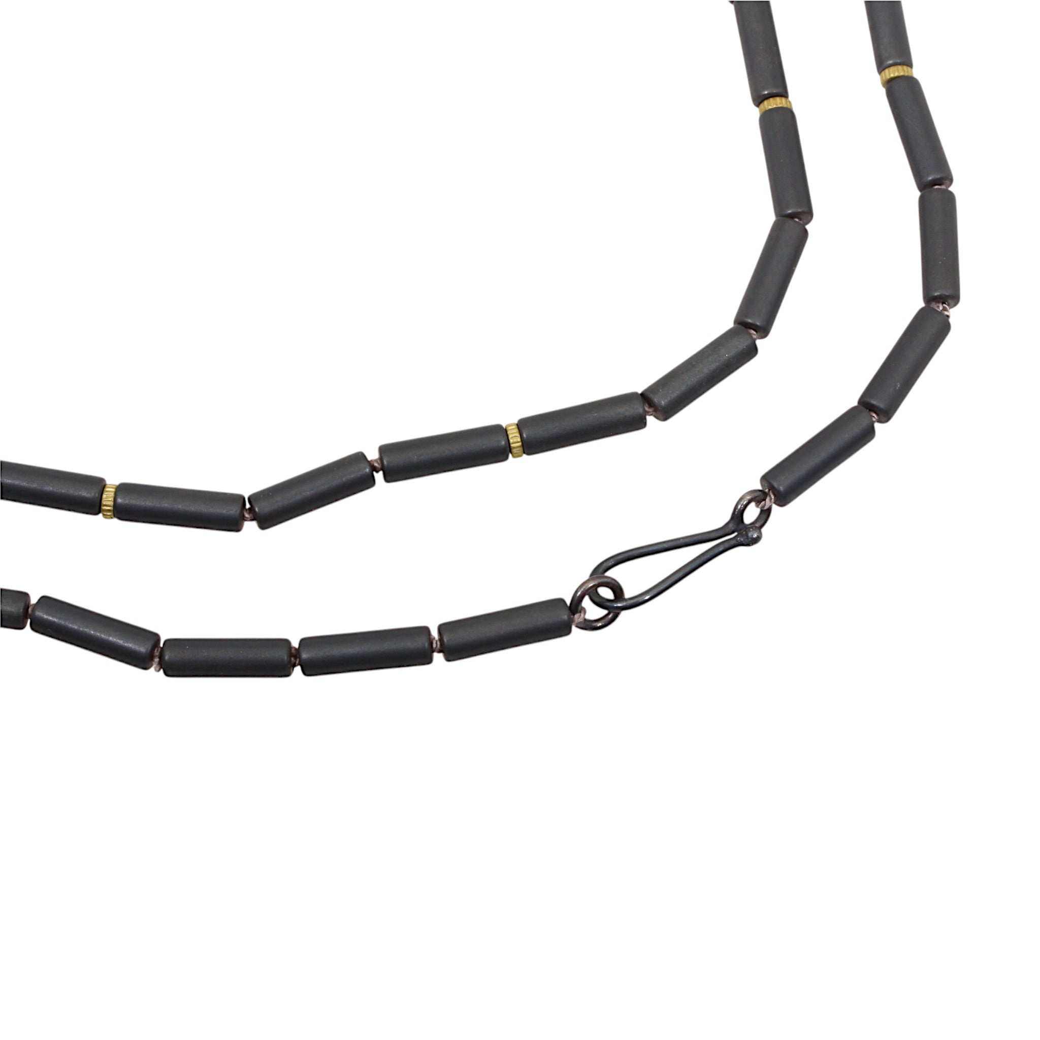 Matte Hematite Tube and Brass Gear Bead Necklace with Oxidized Silver Clasp
