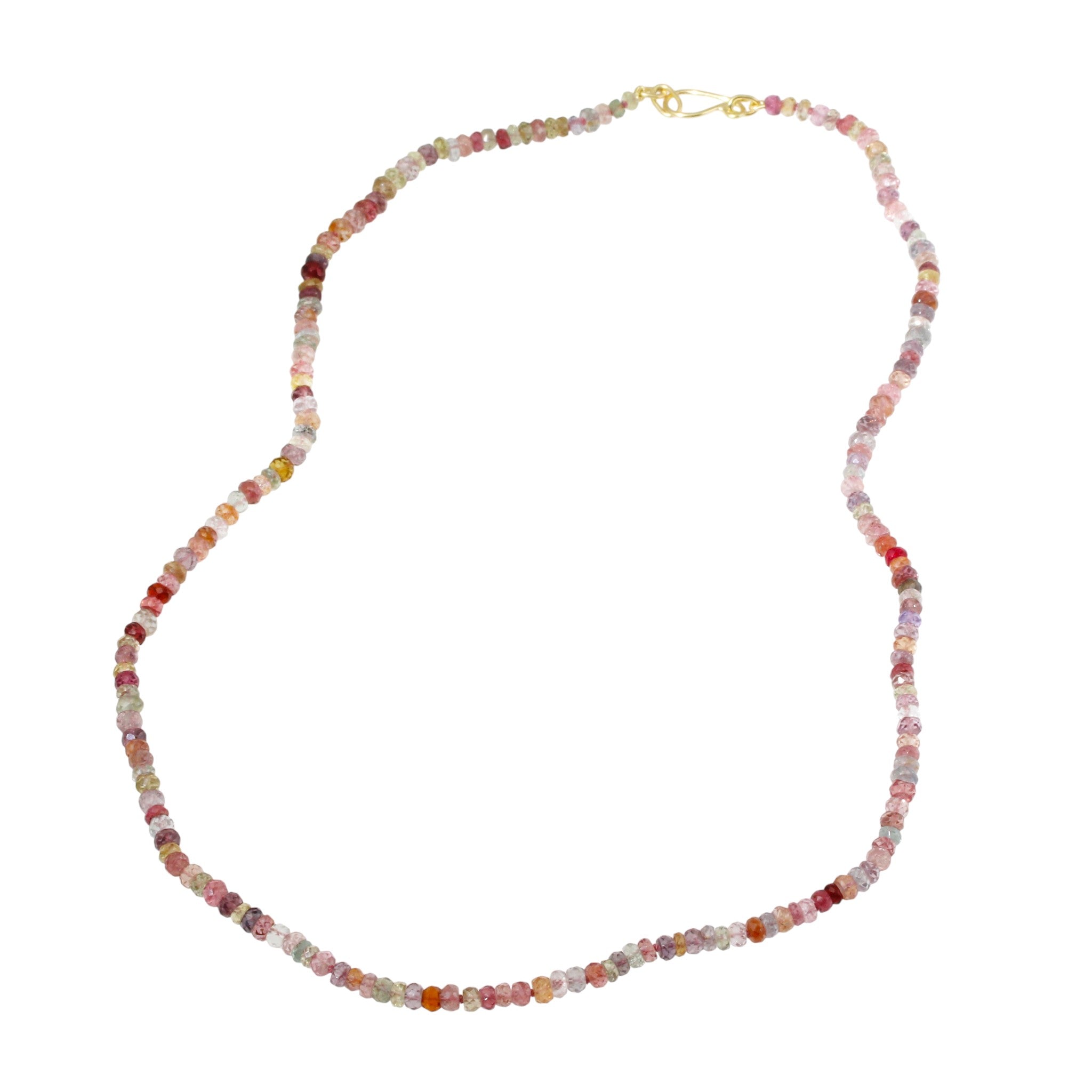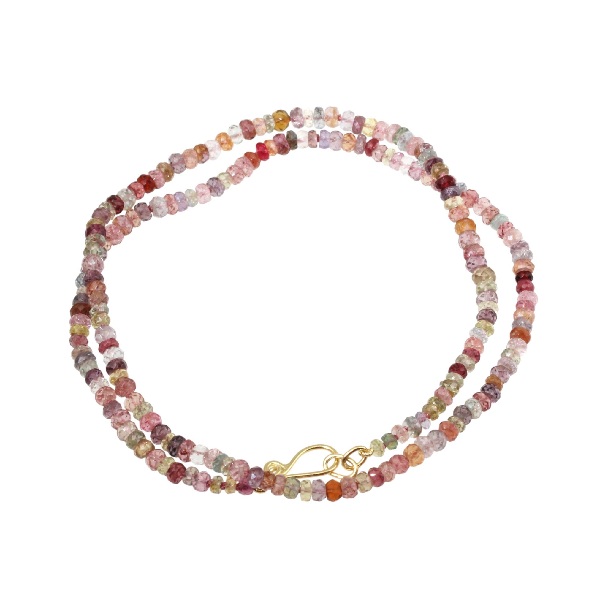 Faceted sapphire and spinel beads knotted with pink nylon thread and finished with 18K gold clasp