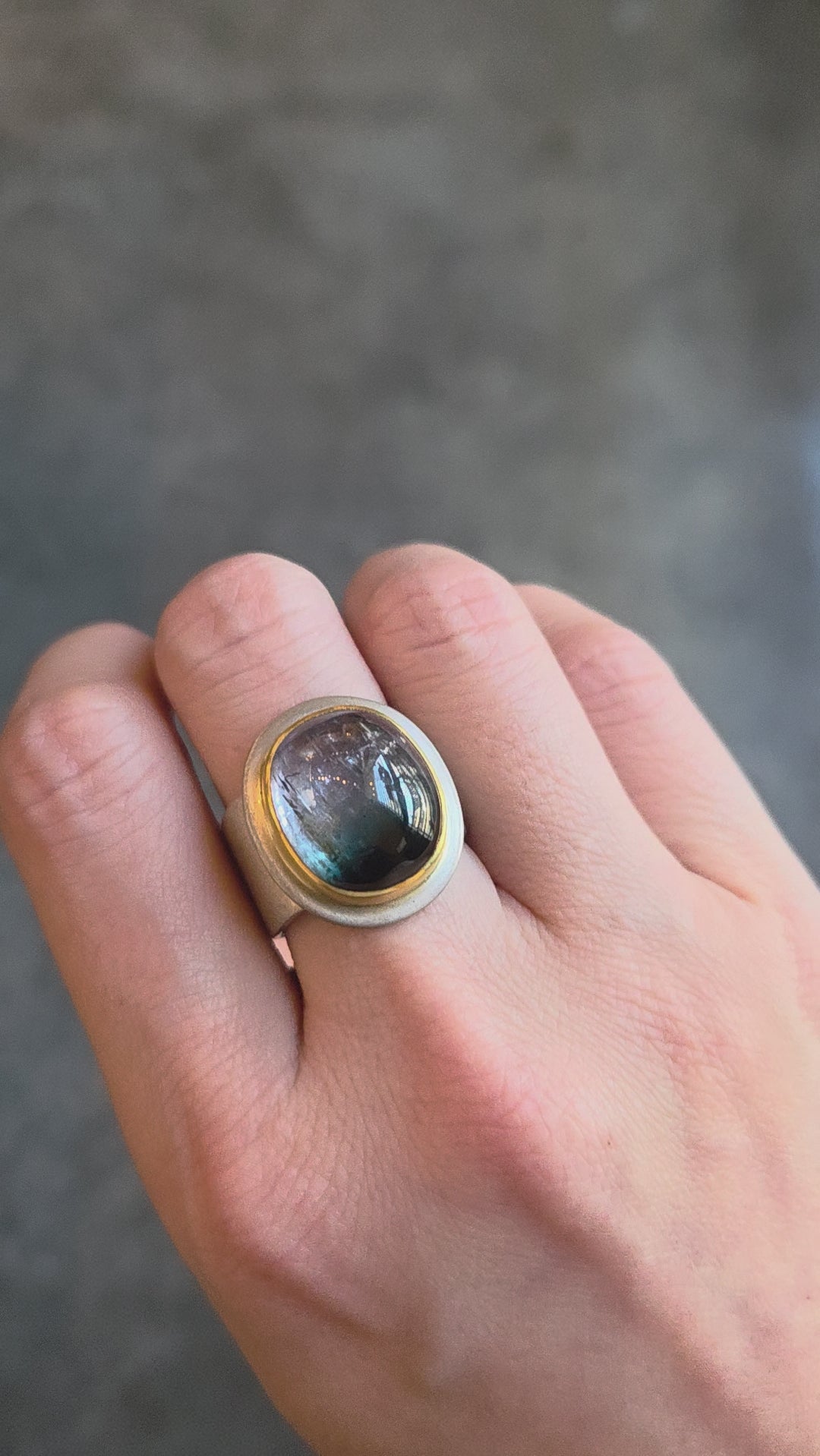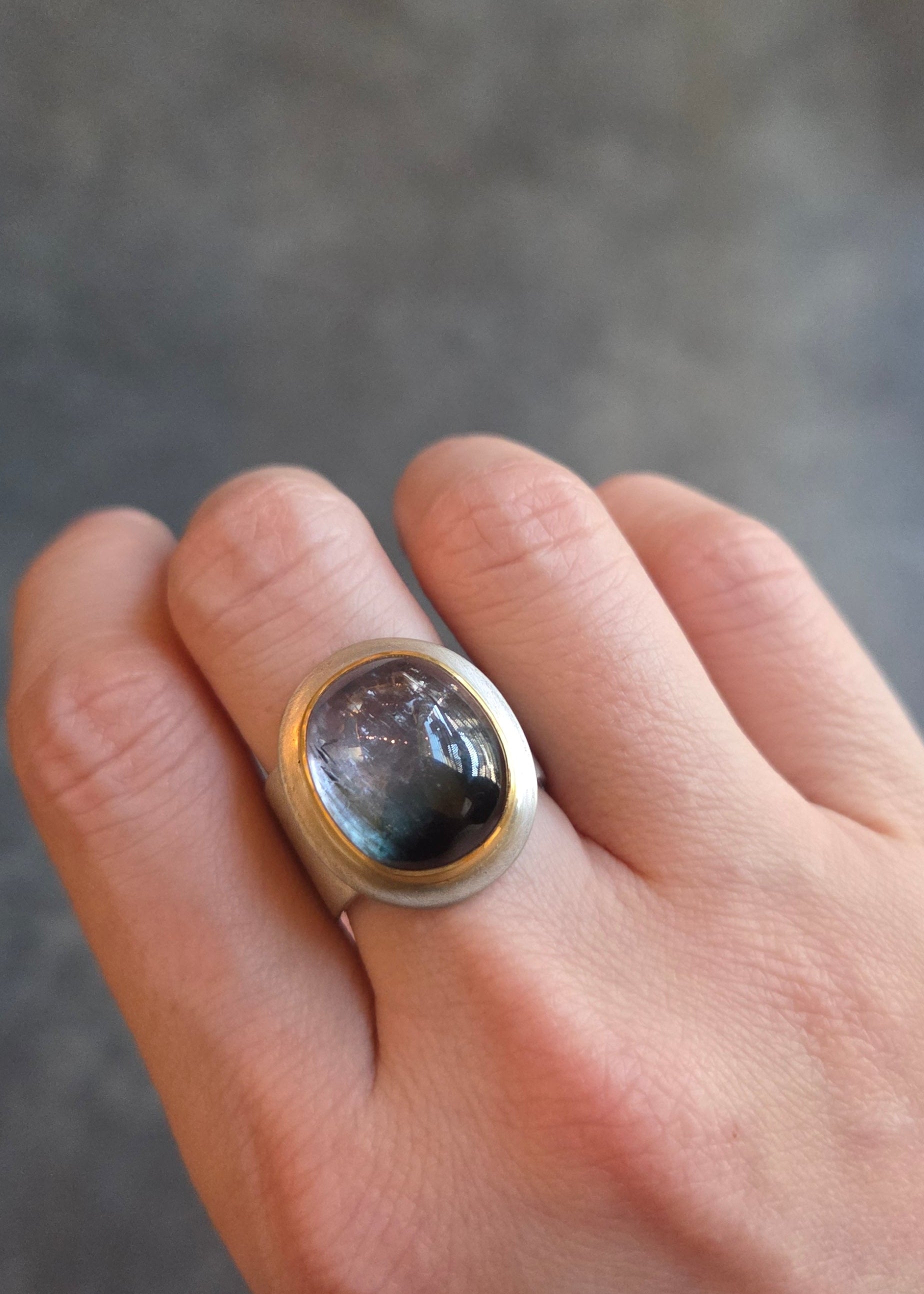 Tri-Color Tourmaline Classic Ring in Silver and 22k Goldapproximately 12 carat tri-color tourmaline set in 22k yellow gold, sterling silver