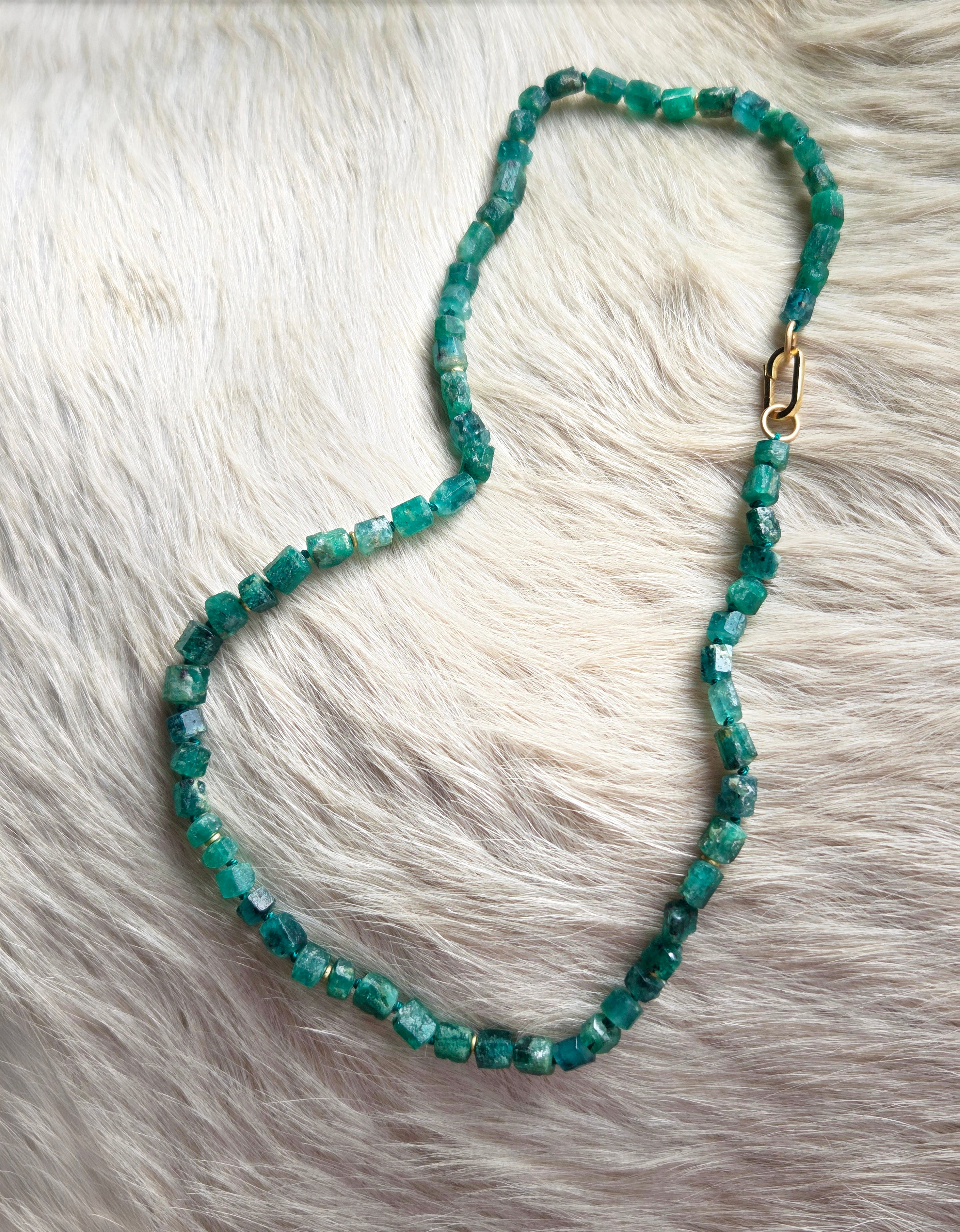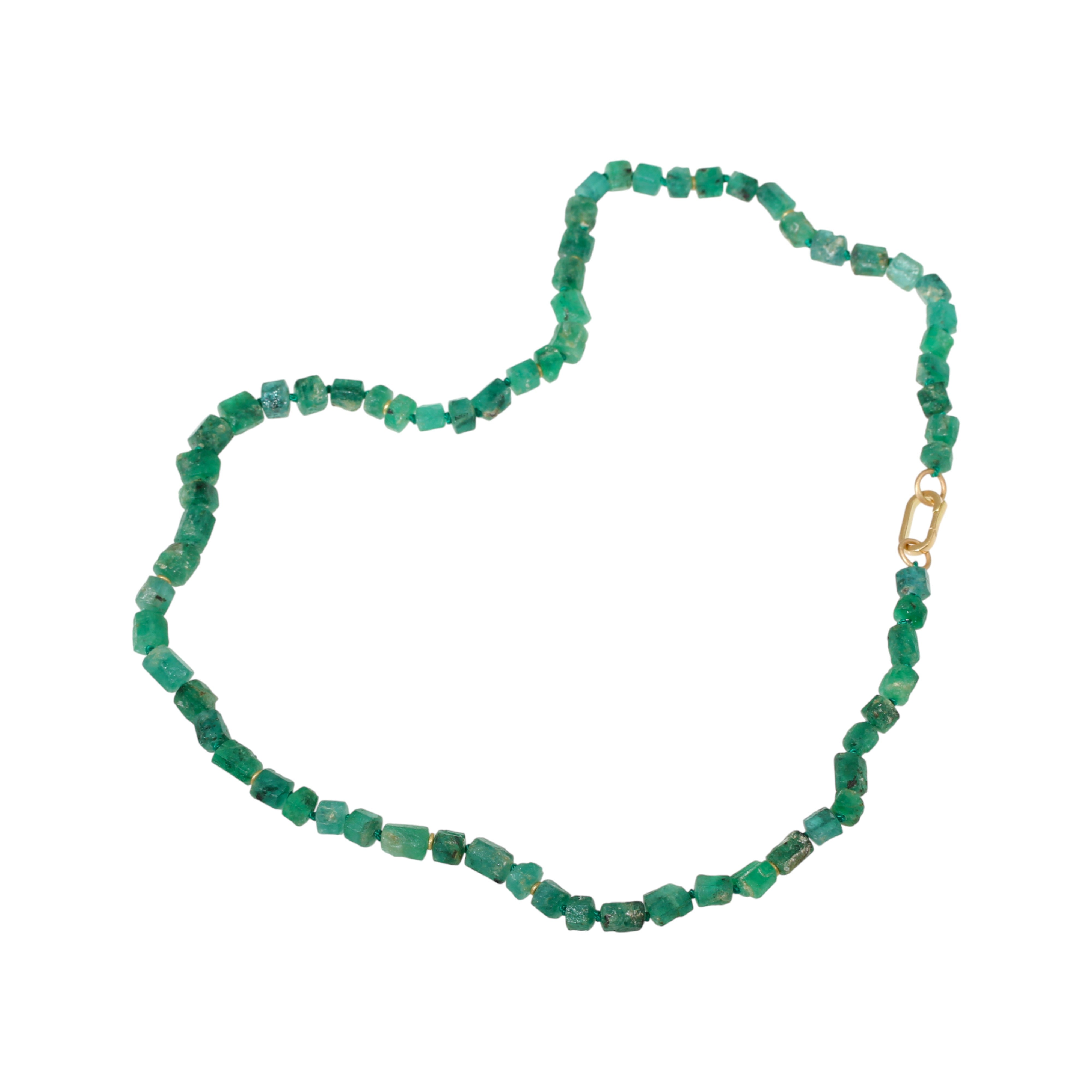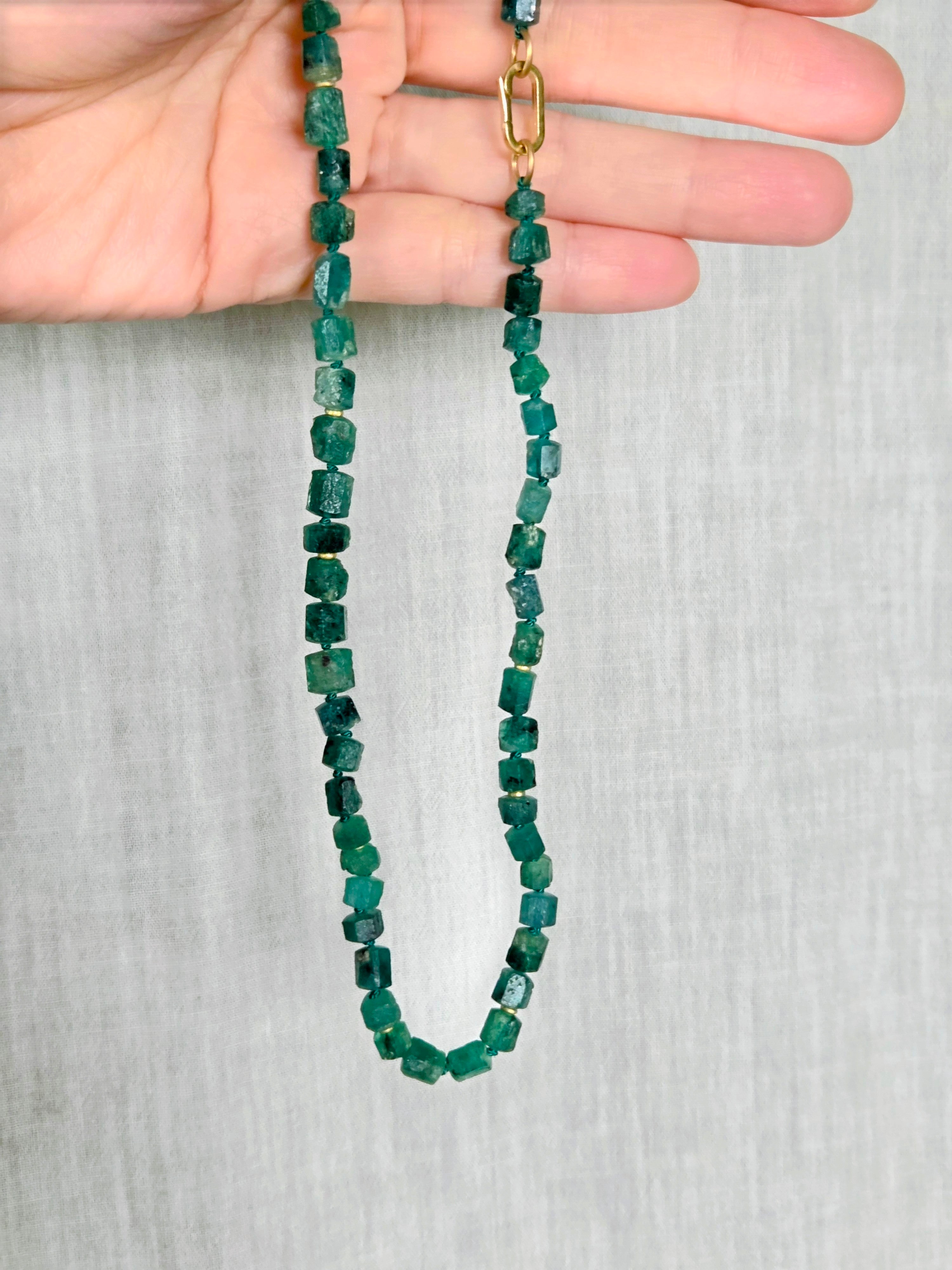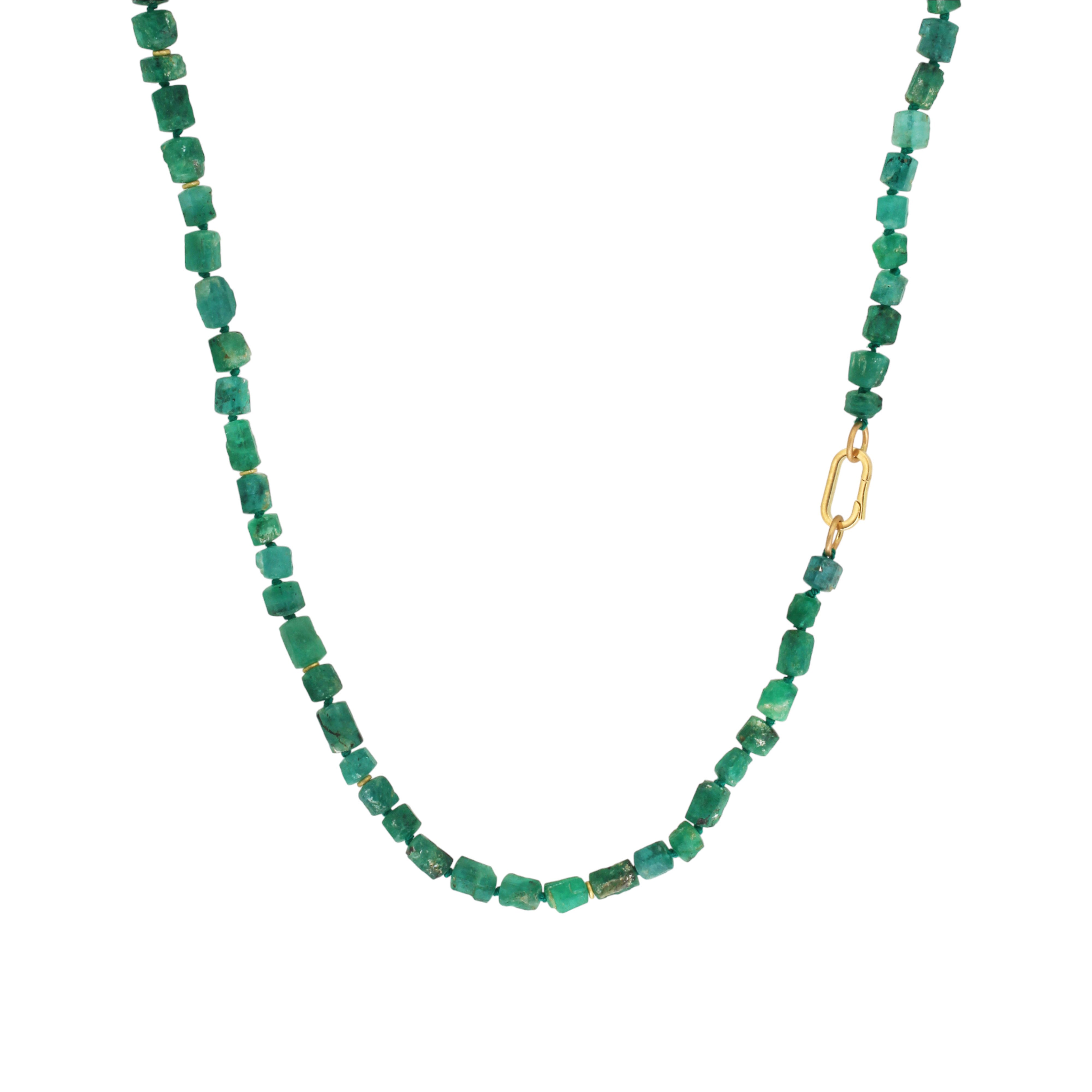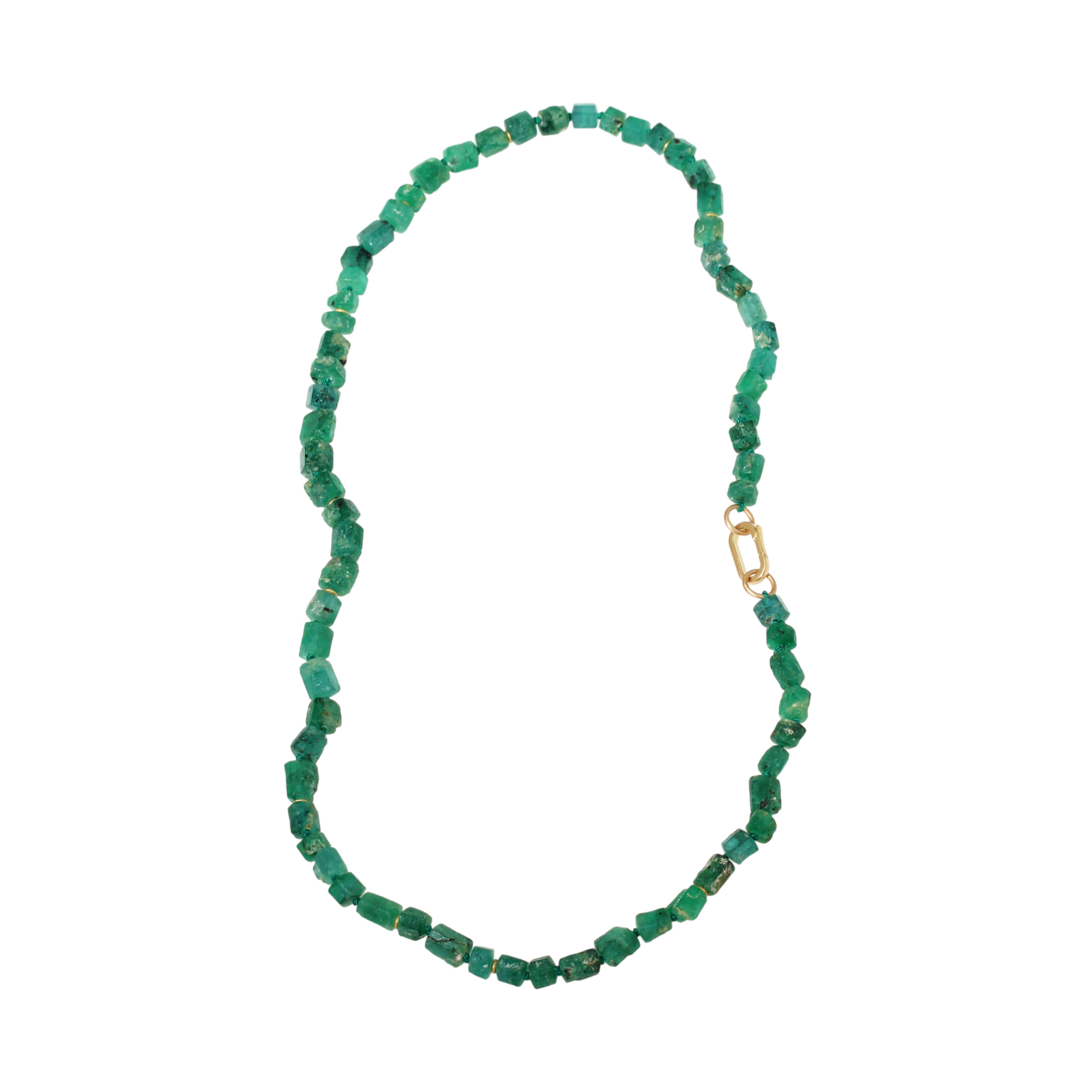 Rough Emerald Bead Necklace with 18k Gold Beads and 18k Gold Carabiner