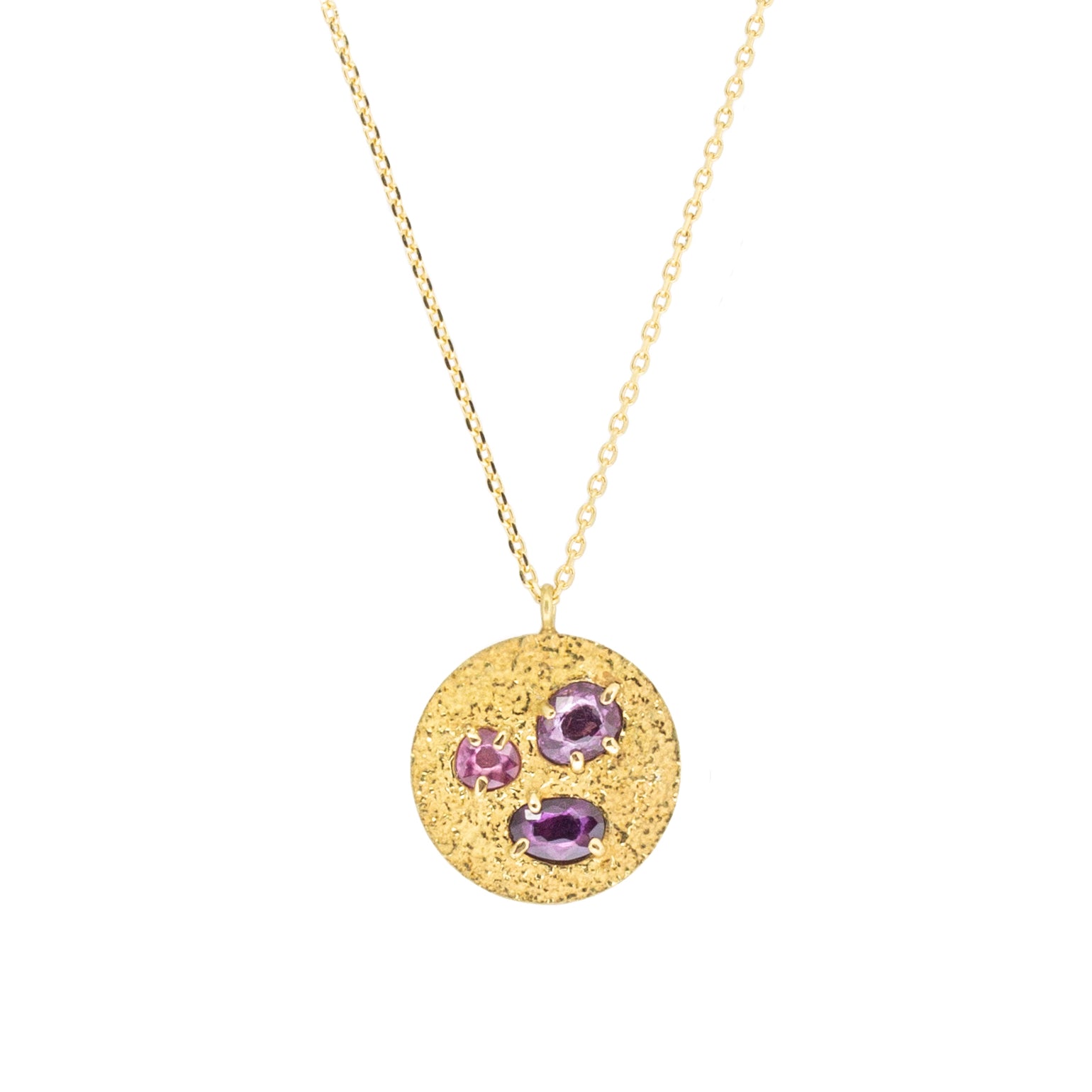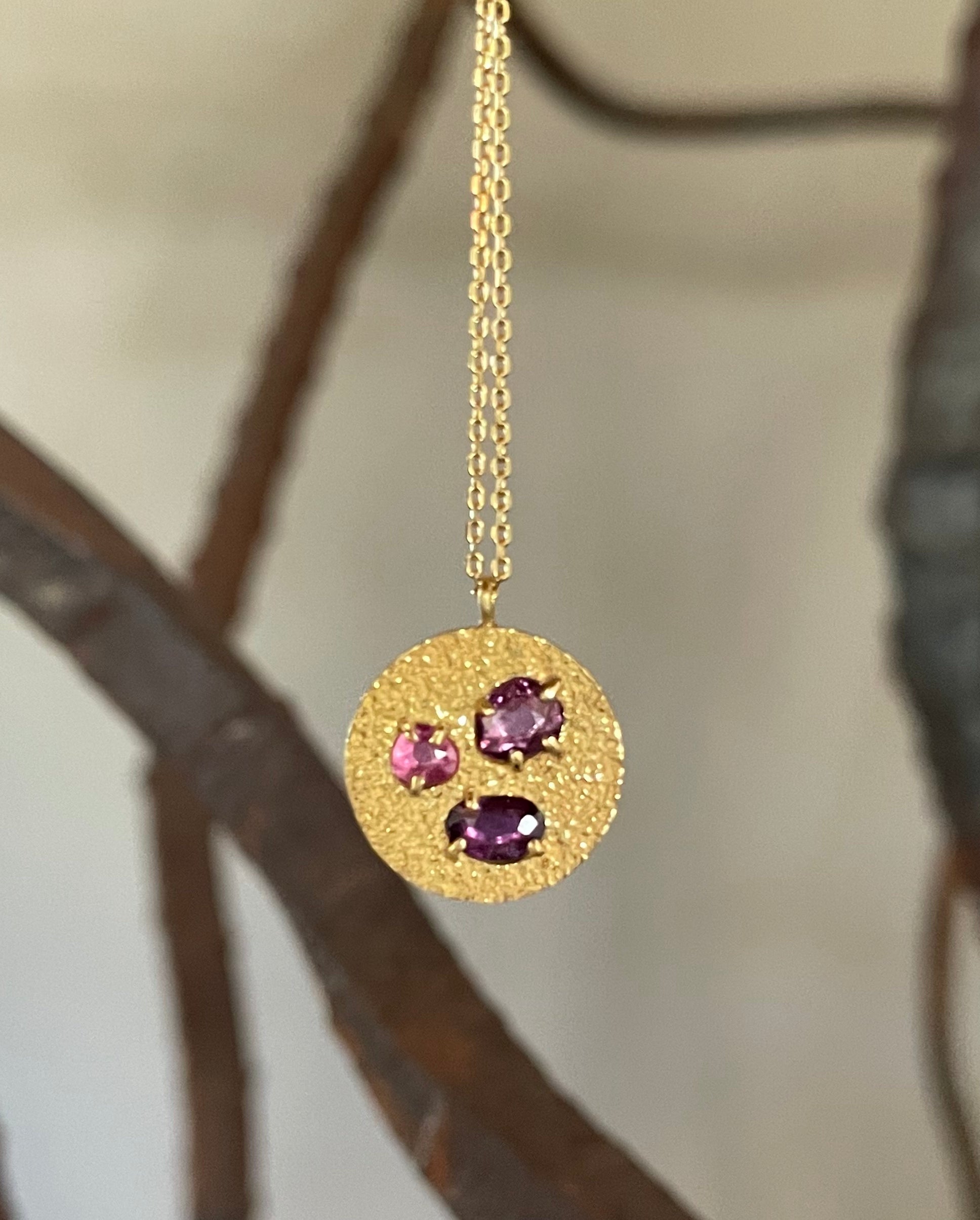 Small Round Pendant with Tri-Color Sapphires in Sand-Textured 18k Yellow Gold