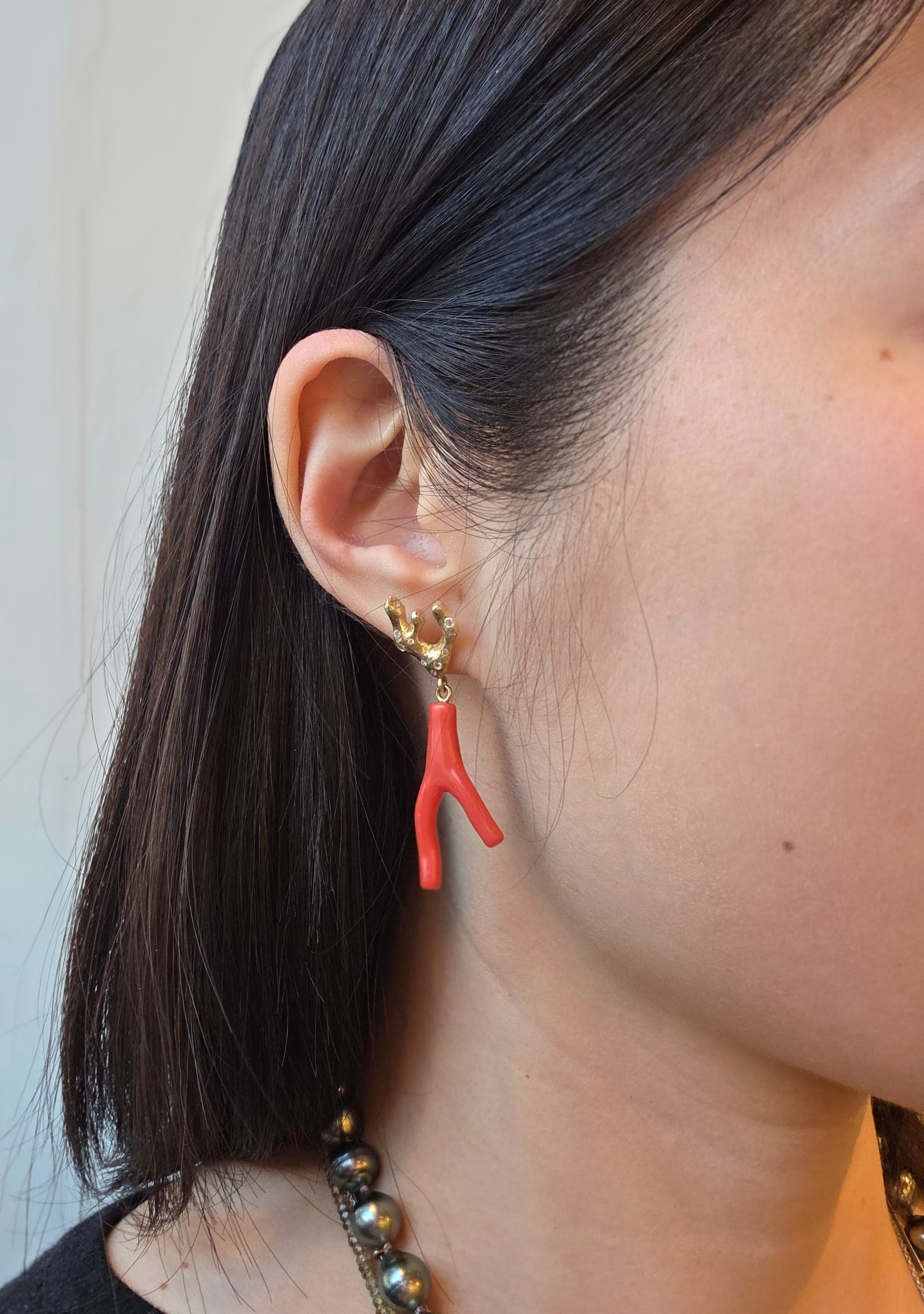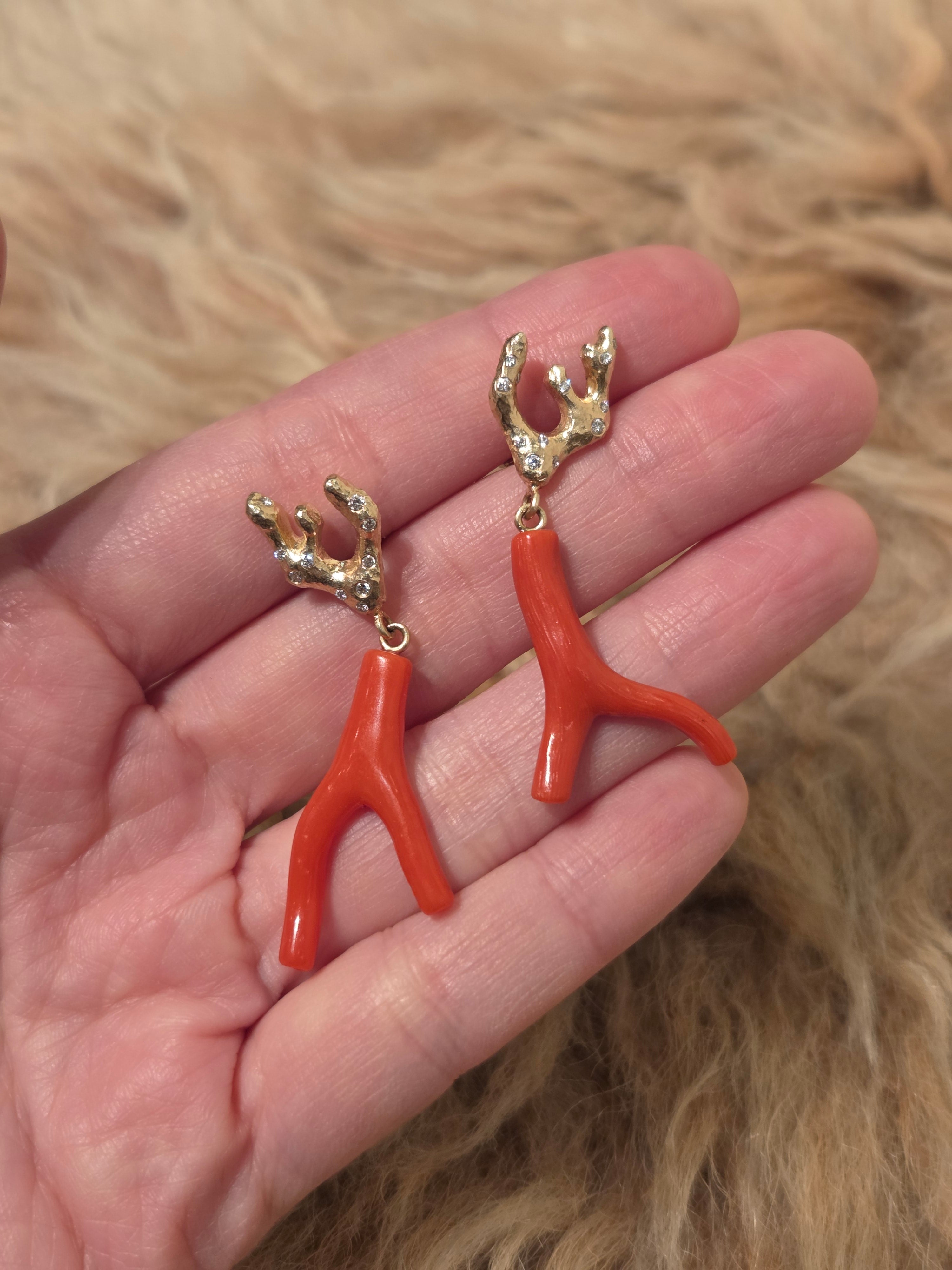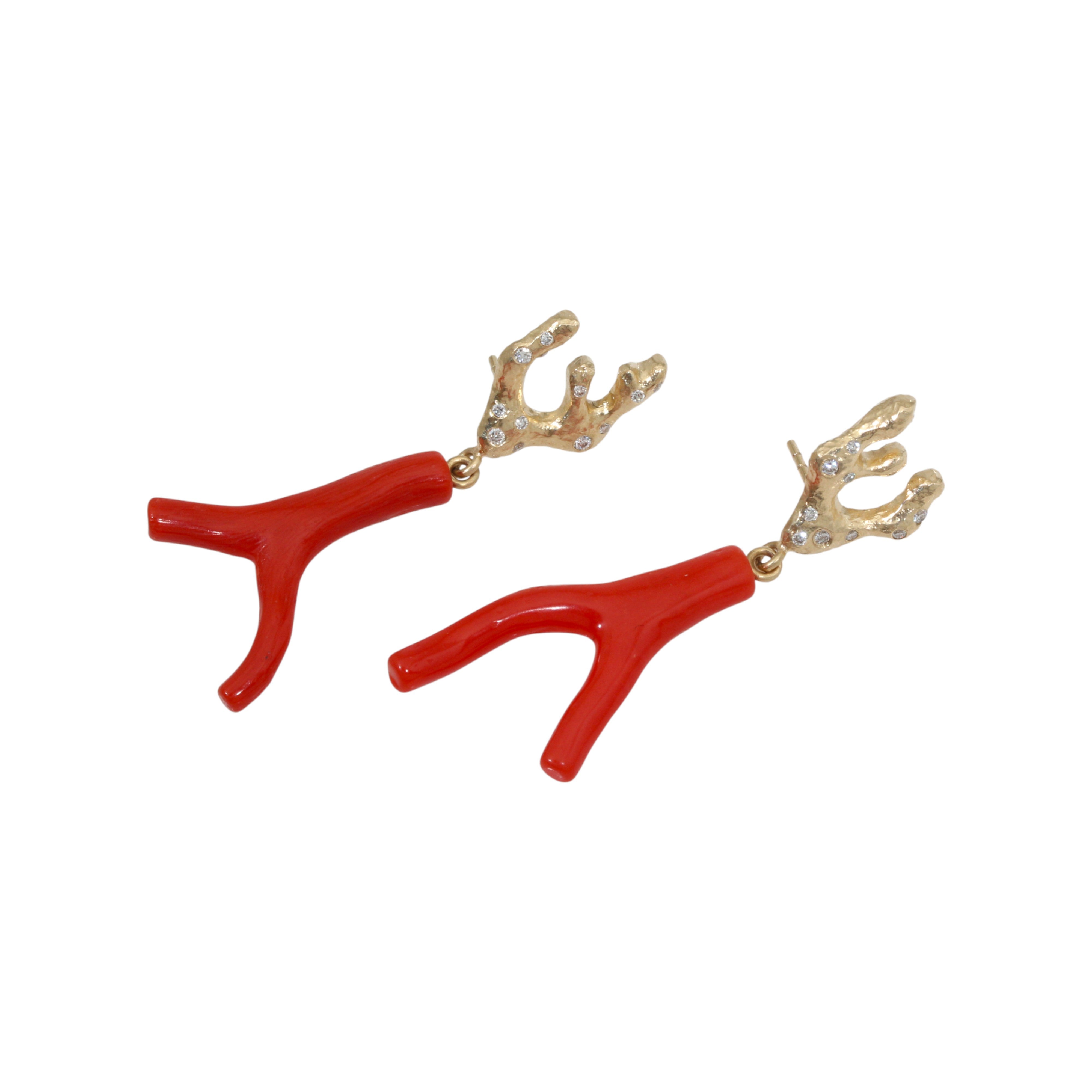 Sculpted Branch and Red Coral Post Dangle Earrings with 10k Gold with White diamondsred coral, 10k yellow gold, lab grown diamonds