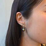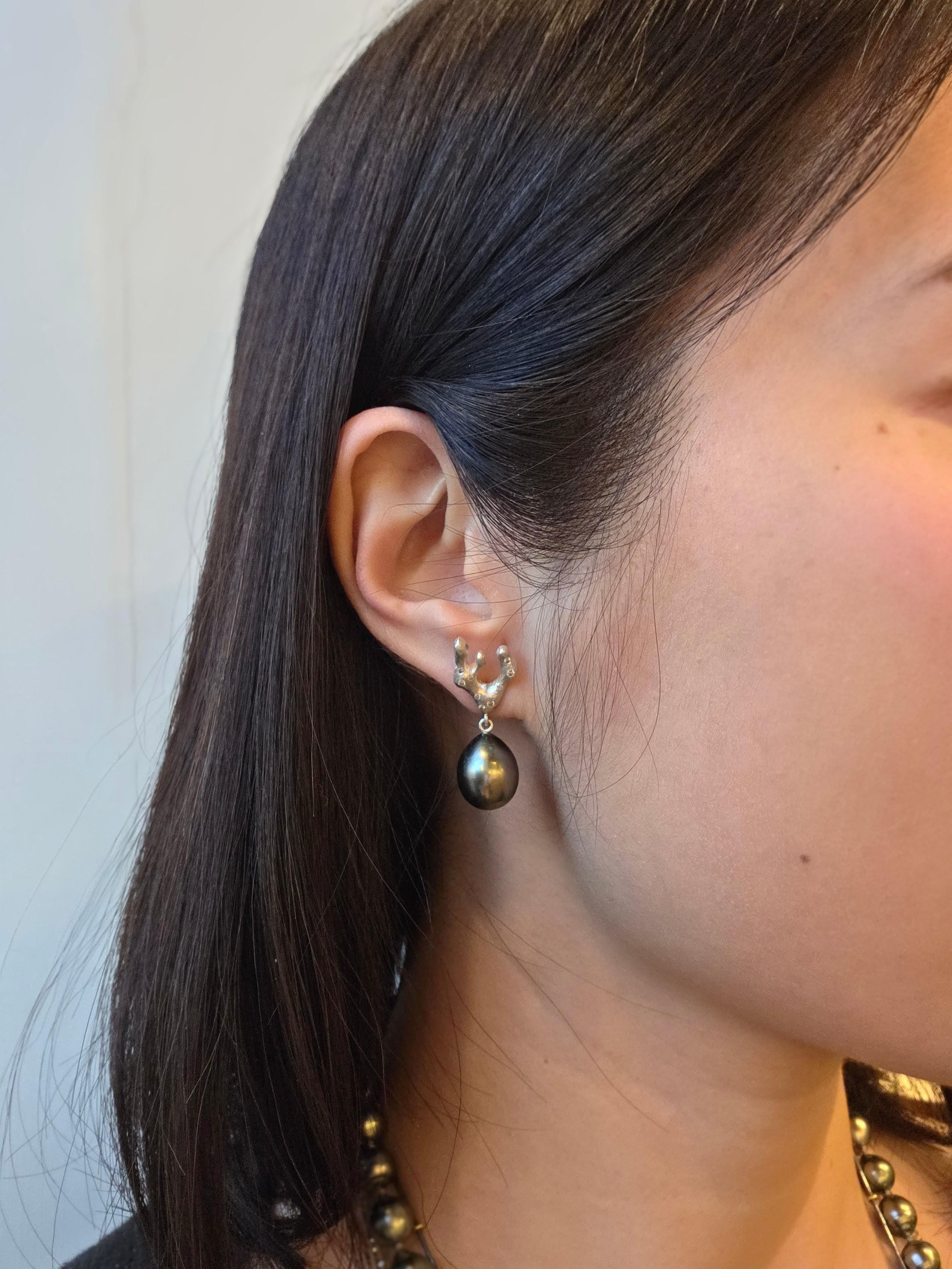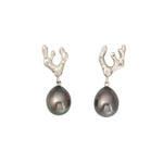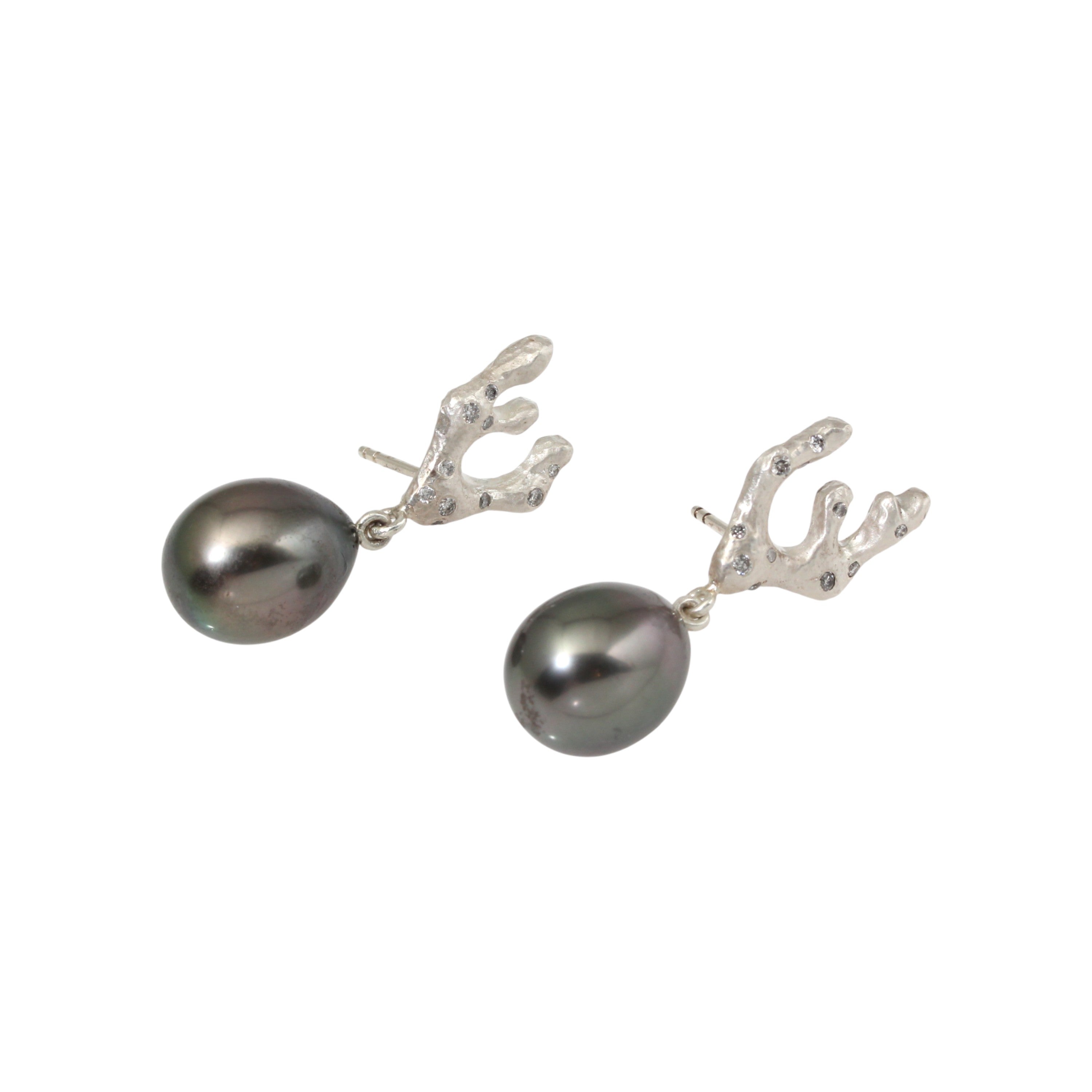 Sculpted Branch Post Dangle Earrings in Brushed Silver w/ Tahitian Pearls & Grey DiamondsTahitian pearl, silver, grey diamonds