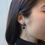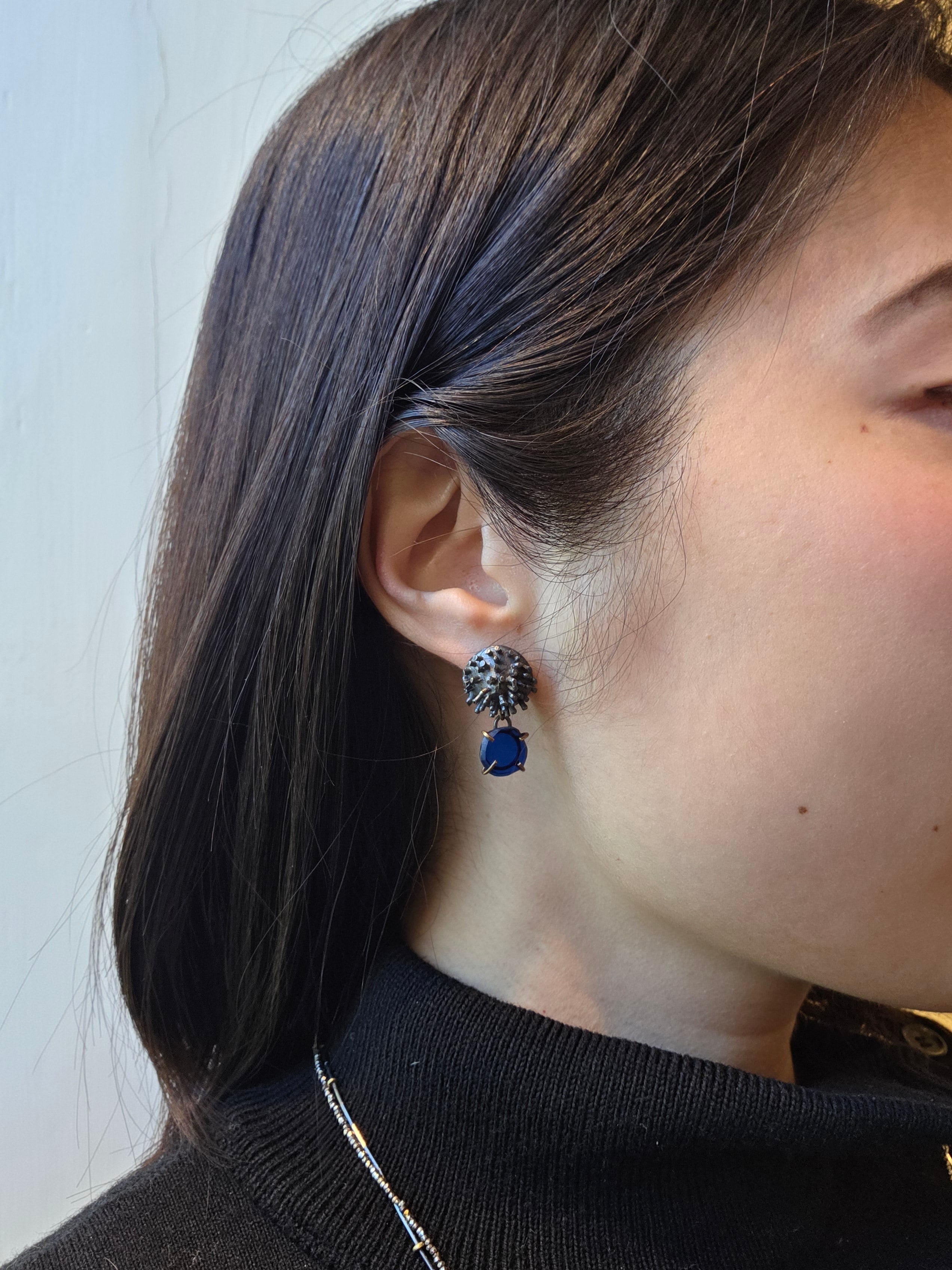 Sea Urchin and Blue Glass Post Dangle Earrings in Oxidized Silverblue glass, oxidized silver