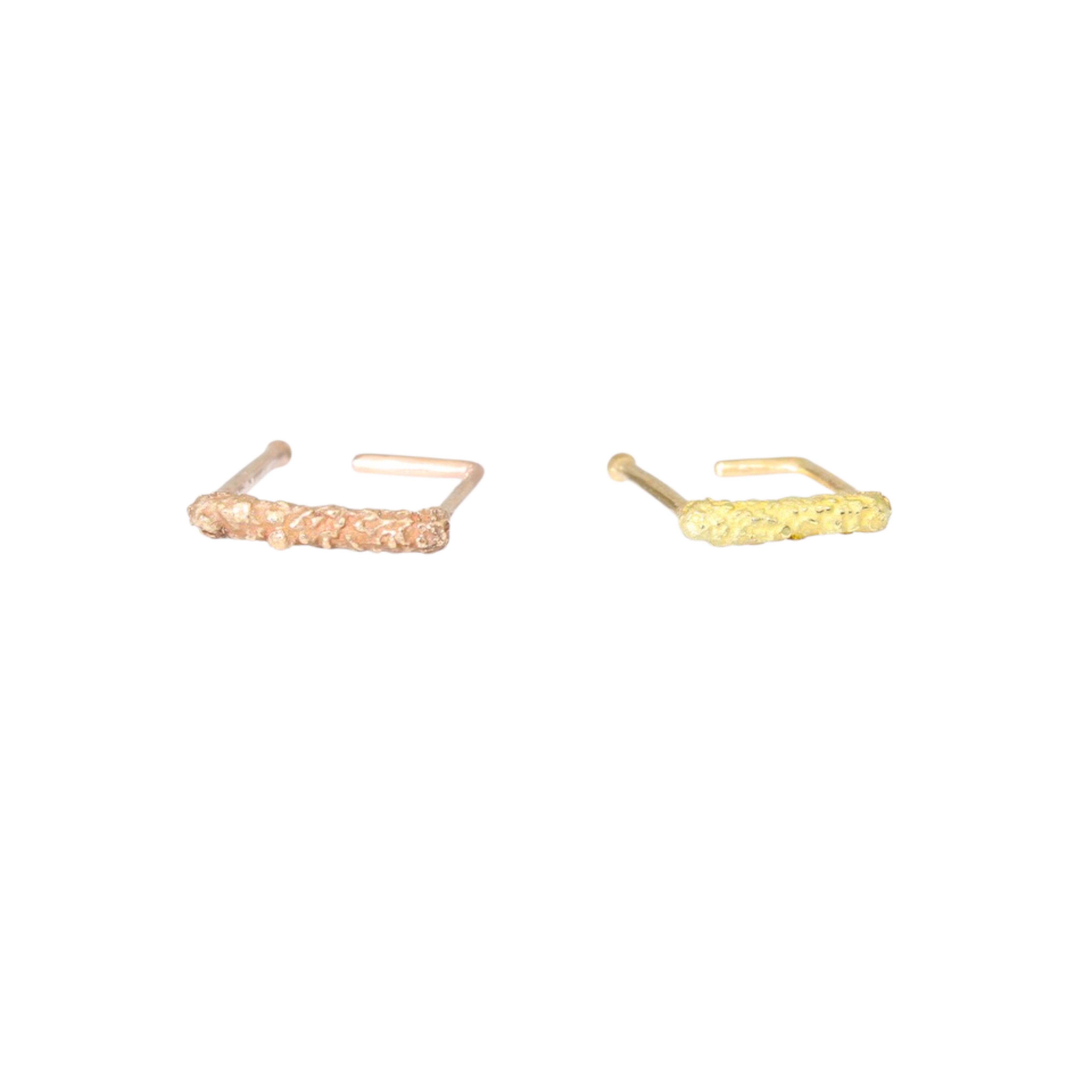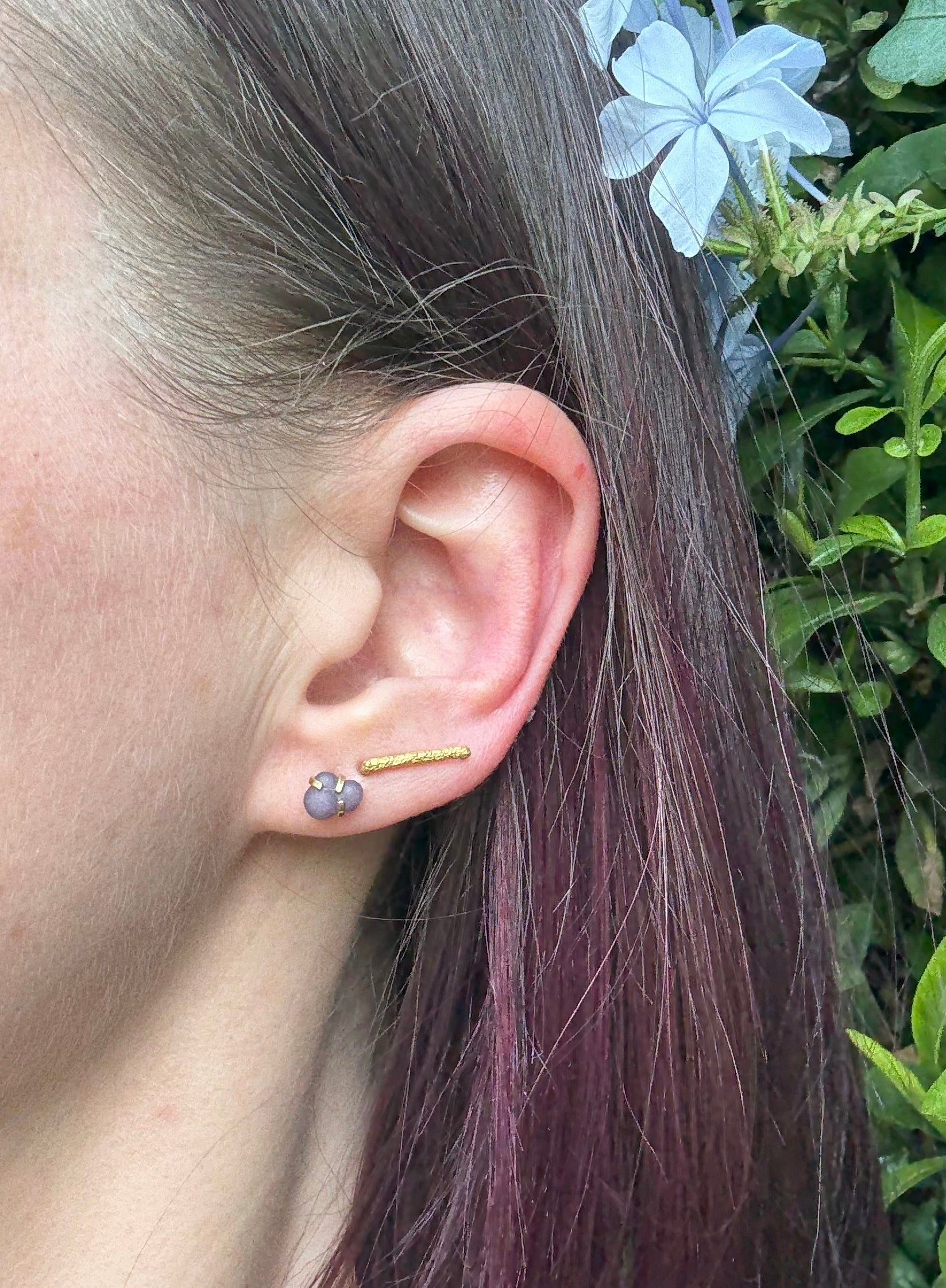 The staple earring format is designed to be worn in two holes. This earring is cast with the texture of Northern California beach sand. The recesses in this texture are matte, while the raised parts are shiny, giving you a subtle sparkle.